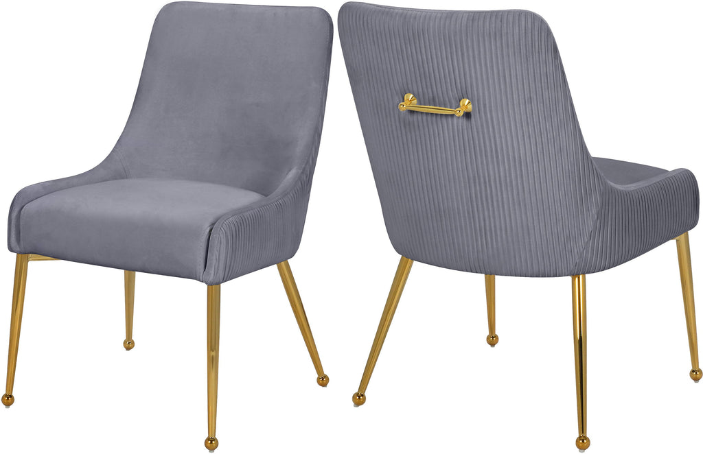 Elegance invades your dining room when you add this Ace velvet dining chair to the mix. This beautiful chair features the bells and whistles you need to take your dining room to the next level decoratively. The chair is outfitted in soft grey velvet upholstery with a pleated design for added textural appeal. Polished gold legs with ball feet and a matching gold handle on the back round out the design on a stylish note.