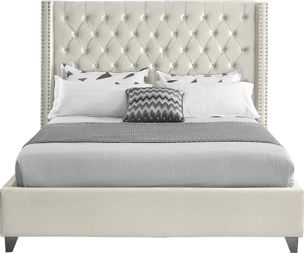 Elegant and eye-catching, the stunning Aiden Bed from Meridian Furniture is the perfect addition to any bedroom. Rich velvet covers the deep tufted design. A beautiful wing bed design is complimented by hand applied chrome nail head details. Strength and beauty is guaranteed with a solid wood frame and stainless steel legs.