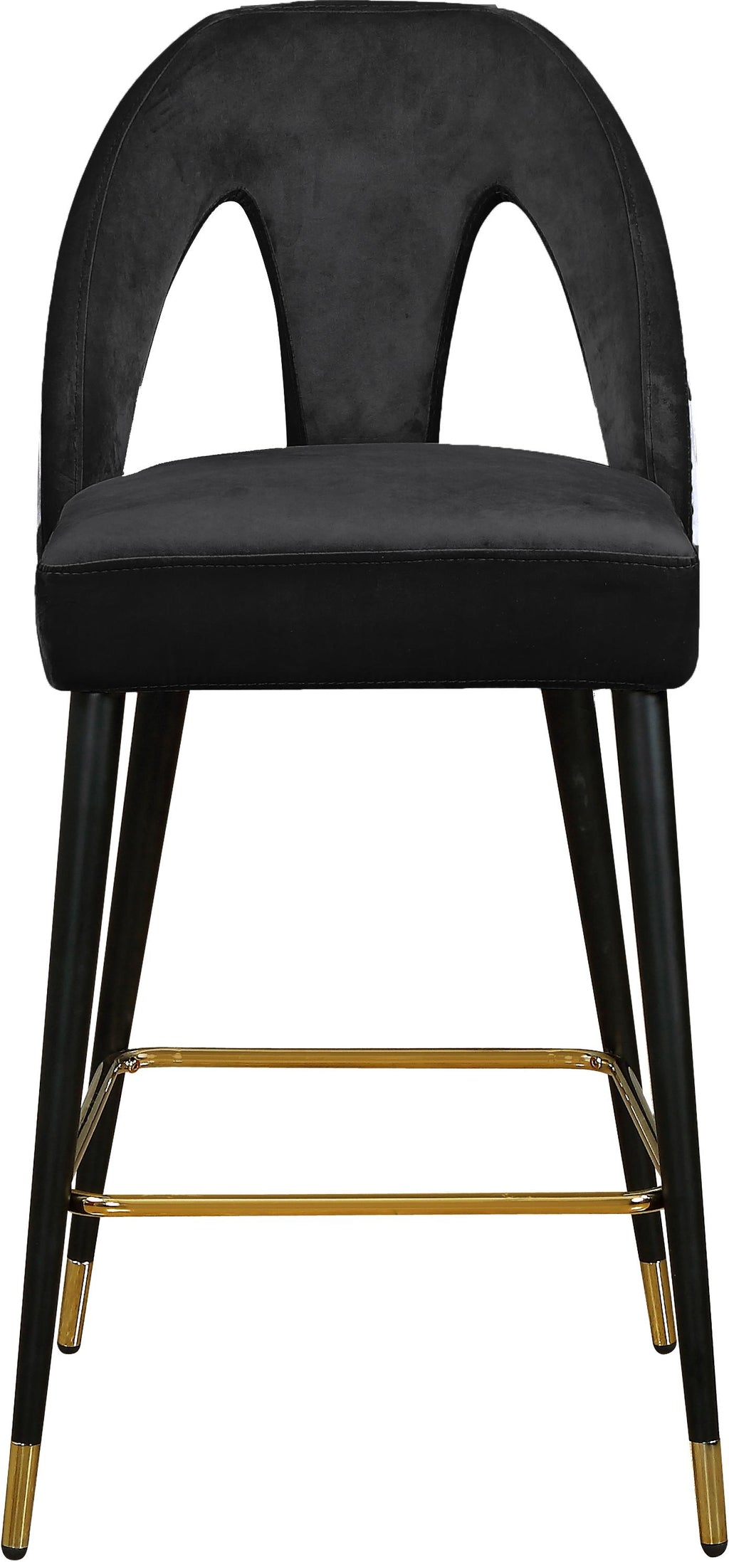 Modern and traditional elements collide in the design of this Akoya Black Velvet Stool. Velvet upholstery covers the back and seat, giving it a decidedly glamorous look while two strategic cutouts provide just a hint of bold, modish fun. The gold nailhead trim on the back adds an edgy vibe, and metal legs in a black finish with goldtone tips rounds out the stool, providing sturdy support and a contemporary look.