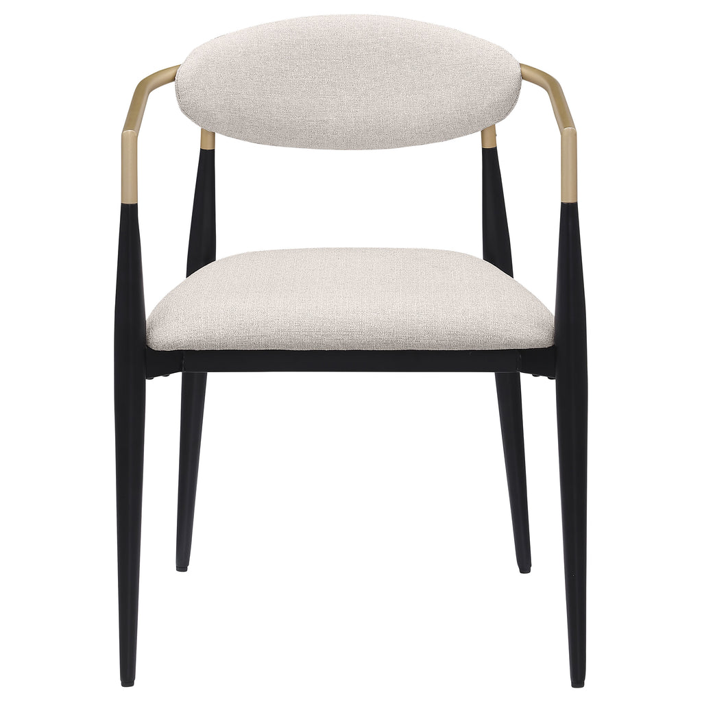 Refresh your dining table with the modern glam flair of a set of two armchairs. Perfect for family and friends, the chair offers impeccable comfort with a padded seat and an oval-shaped backrest with a gentle curvature for excellent support. Its metal frame offers stability and strength, complete with a black powder coated finish. A gold finish is hand-painted on armrests, adding gleaming metallic appeal and warmth. Each chair offers a slim, sleek silhouette, perfect for a modern or mid-century space.