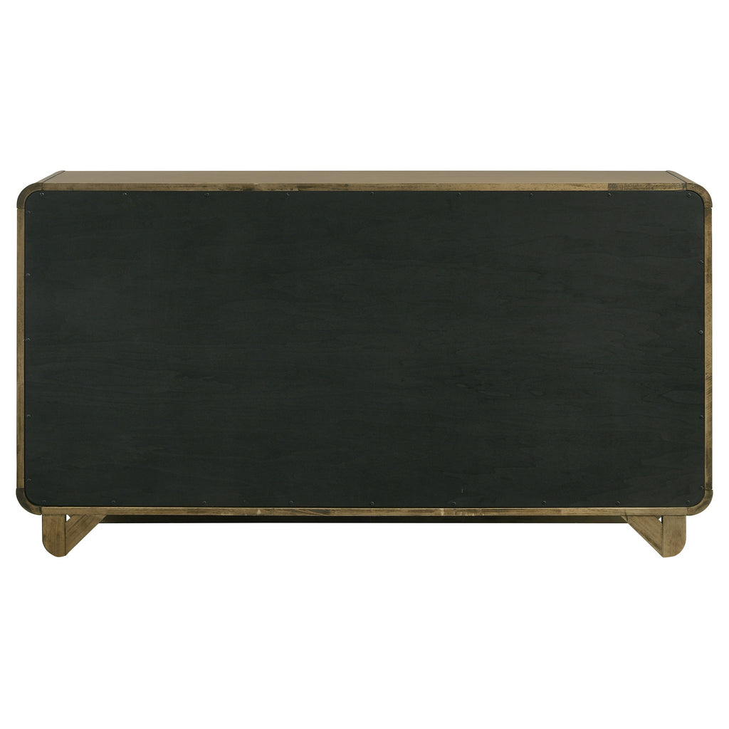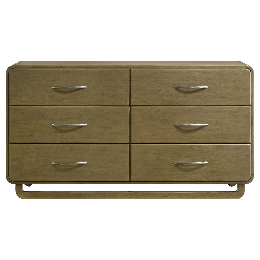 This six-drawer dresser offers a modern and sleek storage solution for your bedroom. The nutmeg wood finish exudes warmth while the rounded corners add a soft, contemporary touch to the design. Each drawer is equipped with metal extension glides, ensuring smooth and effortless operation. The dresser's minimalist design is enhanced by the matte nickel hardware, creating a stylish and practical piece. Crafted from solid Asian hardwood, this dresser is built to last while elevating your bedroom decor.