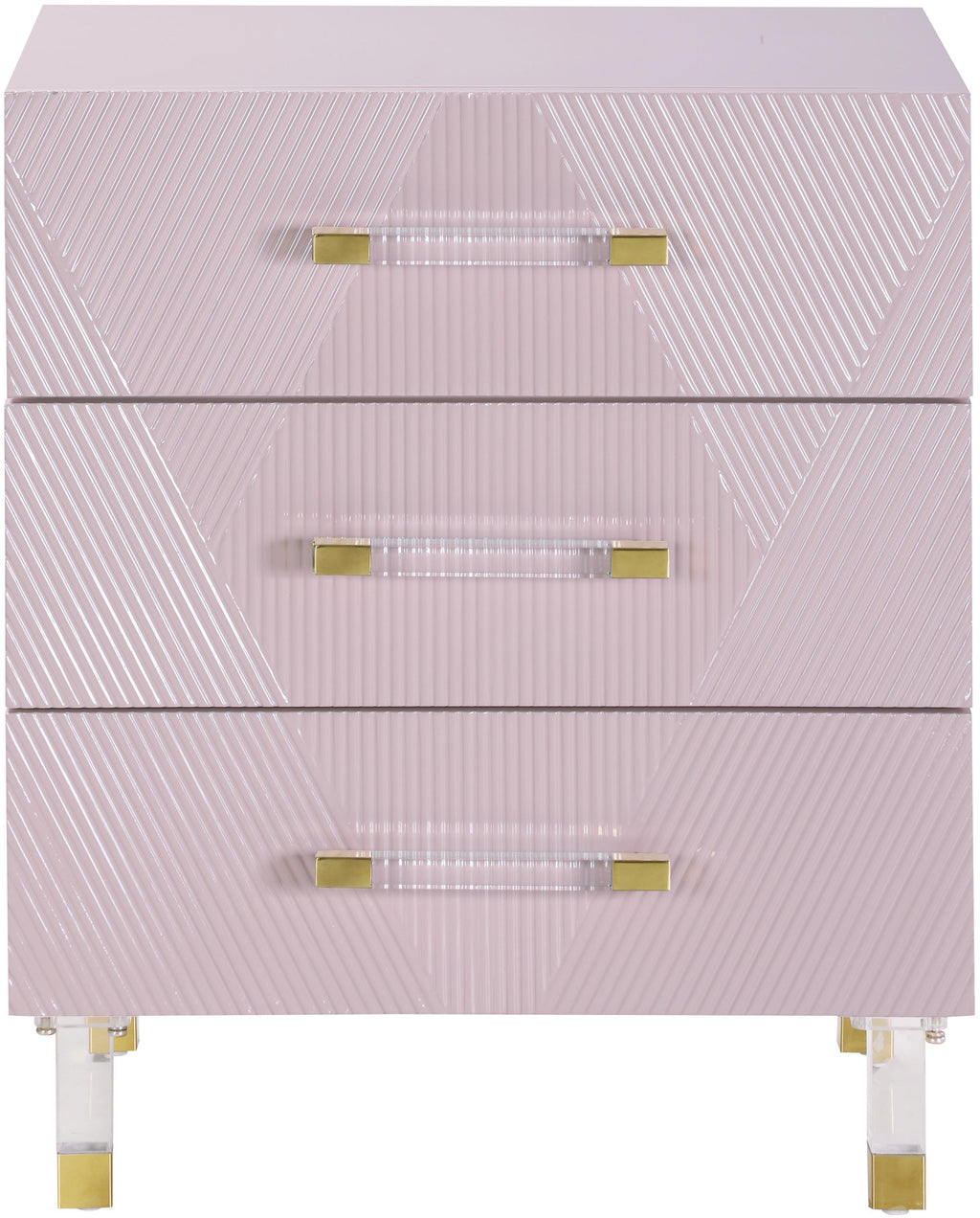 The things you need most at night stay organized and ready for use inside this Anastasia Side Table. This lovely table features a pink lacquer exterior with acrylic legs for a look that's uber modern and sophisticated in your bedroom sanctuary. The three drawers glide open easily, allowing plenty of room for holding reading material, night-time medicines, and other essentials. Sleek hardware on the front adds to the Anastasia Side Table's modish look, ensuring its easy fit in your contemporary bedroom.
