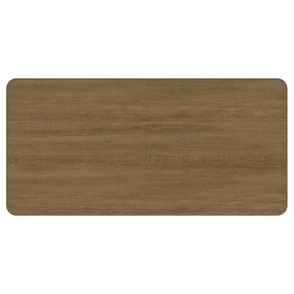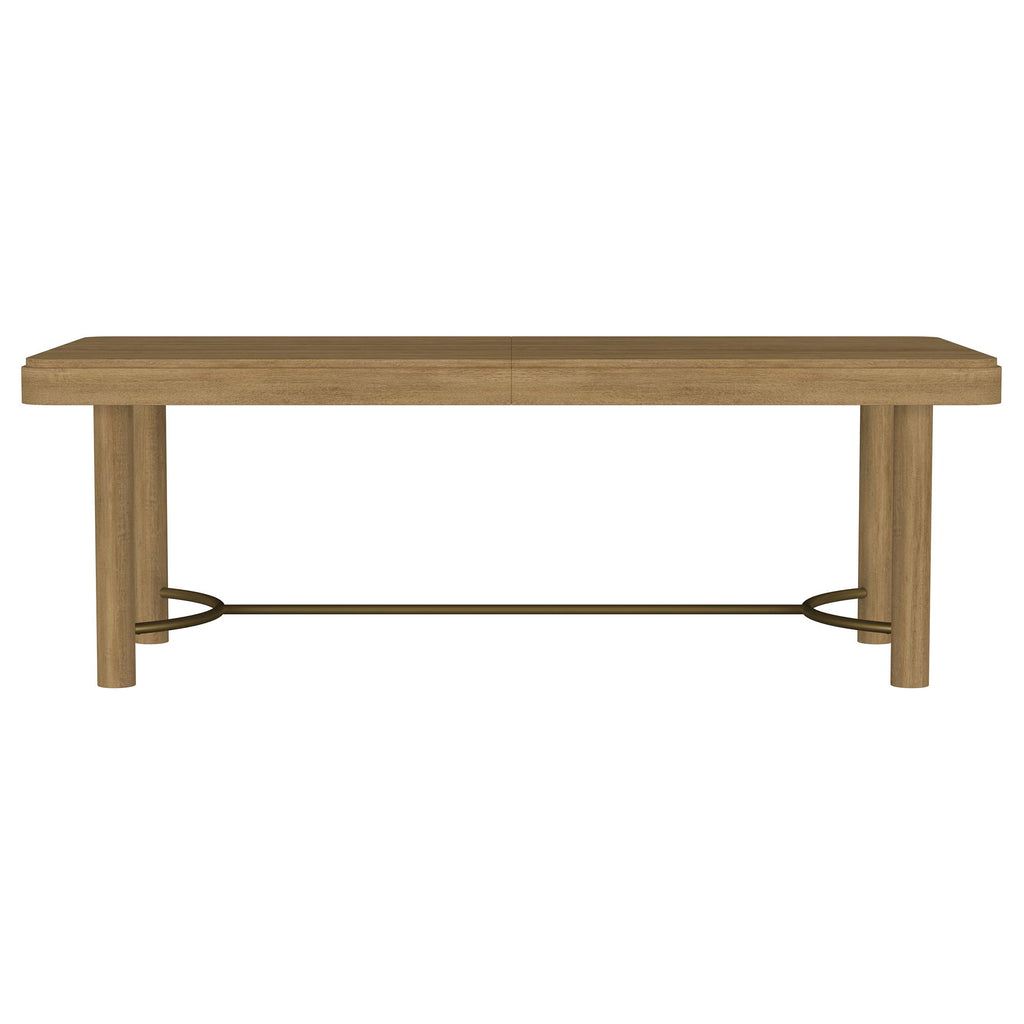 This dining table blends modern refinement with functional design, featuring a trestle base with a metal stretcher bar that adds a contemporary industrial touch. The rounded corners soften the clean lines of the rectangular tabletop, creating a welcoming aesthetic. A removable 18-inch leaf extends the seating capacity, while smooth equalizing metal cable glides ensure effortless, single-person operation. Crafted from solid Asian hardwood, white ash veneer, and metal, this table offers durability and style for any dining space.