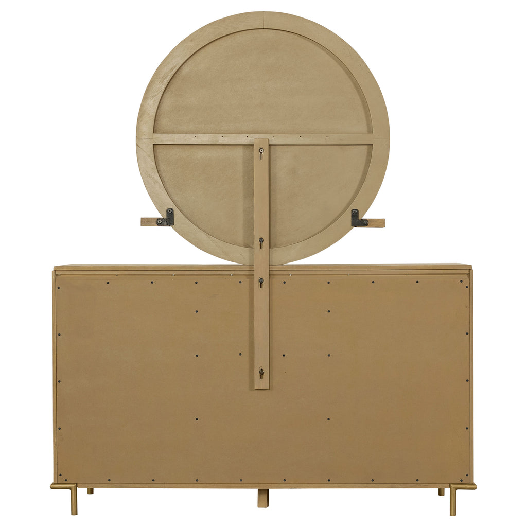 Step into a world of understated elegance with the mid-century modern eight-drawer dresser, its wire-brushed sand wash finish providing a serene backdrop to the aged brass accents. The sleek design, with softly rounded corners and slender legs, offers a sophisticated aesthetic while ensuring ample storage. The felt-lined top drawers cater to your delicate belongings, blending functionality with thoughtful design. Above, the modern dresser mirror, complete with a built-in tray and spacious round reflection, maximizes your space, allowing for a clutter-free surface and a tranquil bedroom escape.