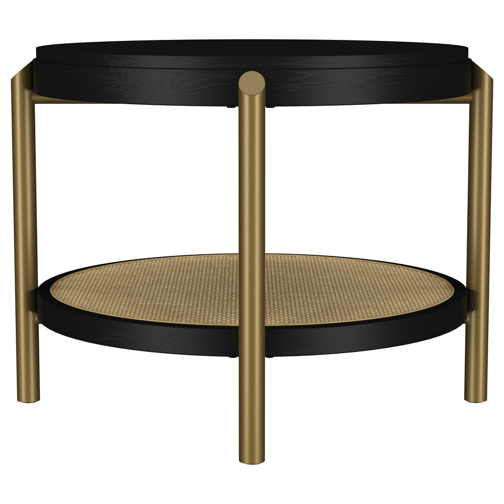 This round end table showcases a refined blend of natural and industrial elements, perfect for modern interiors. Crafted from Asian hardwood, engineered wood, and ash veneer, its finish highlights the table's organic grain for a subtle, rustic appeal. The lower shelf features natural woven rattan, offering functional storage with a stylish touch. Sturdy aged brass-finished metal legs provide contrast and durability. Ideal as a side table or accent piece, it combines elegance and utility effortlessly.