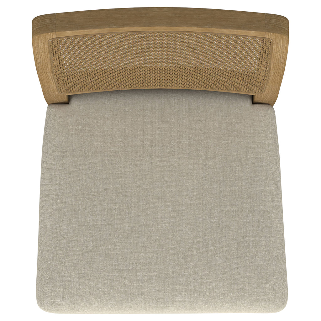 This dining chair combines modern comfort with organic charm, featuring a handwoven cane backrest crafted in Indonesia for a natural, textured appeal. The solid Asian hardwood frame provides durability and a warm aesthetic, while a beige linen-like upholstered cushion enhances its cozy style. Pirelli webbed seat construction ensures both comfort and lasting support. Reinforced with a sleek metal stretcher bar, this chair balances beauty and functionality.