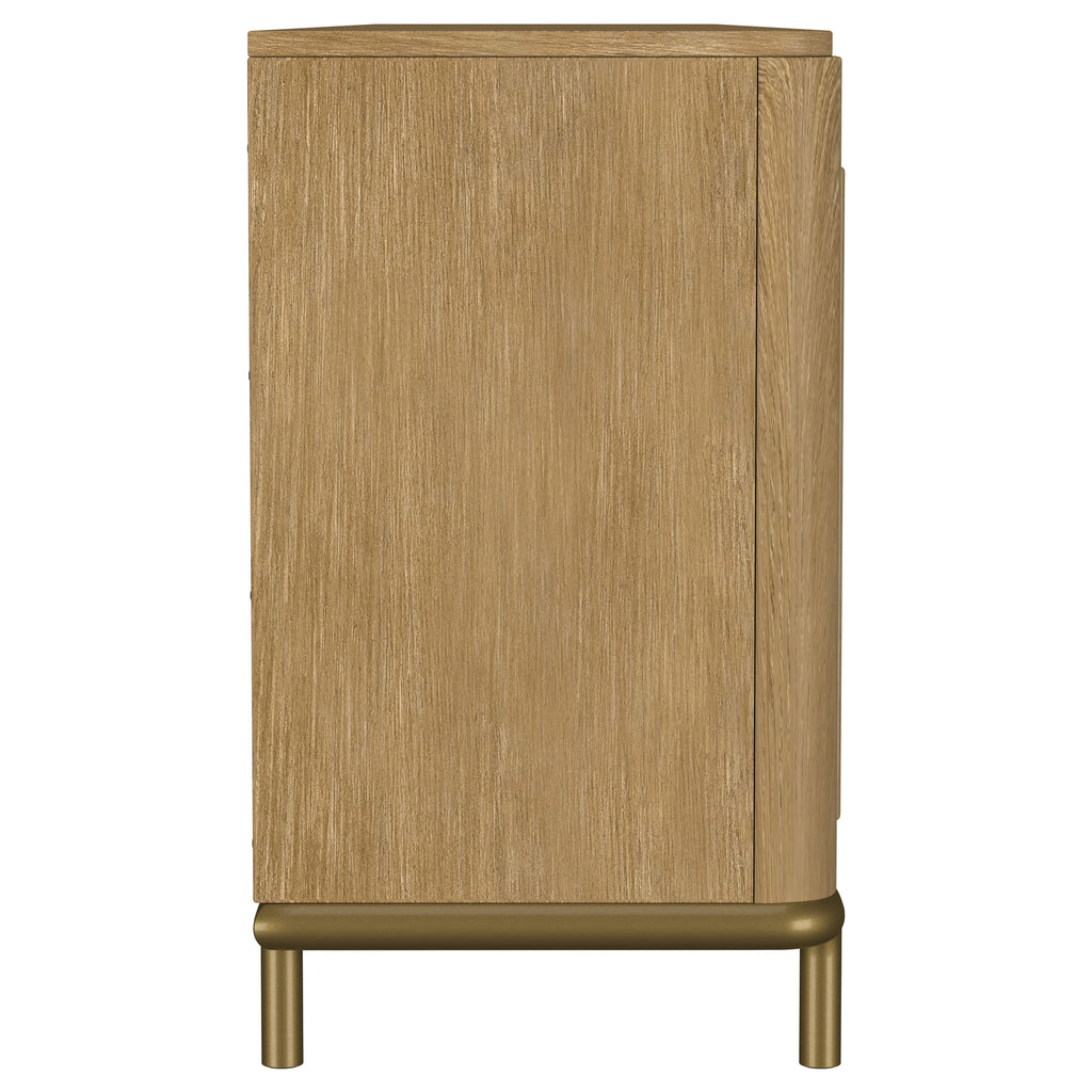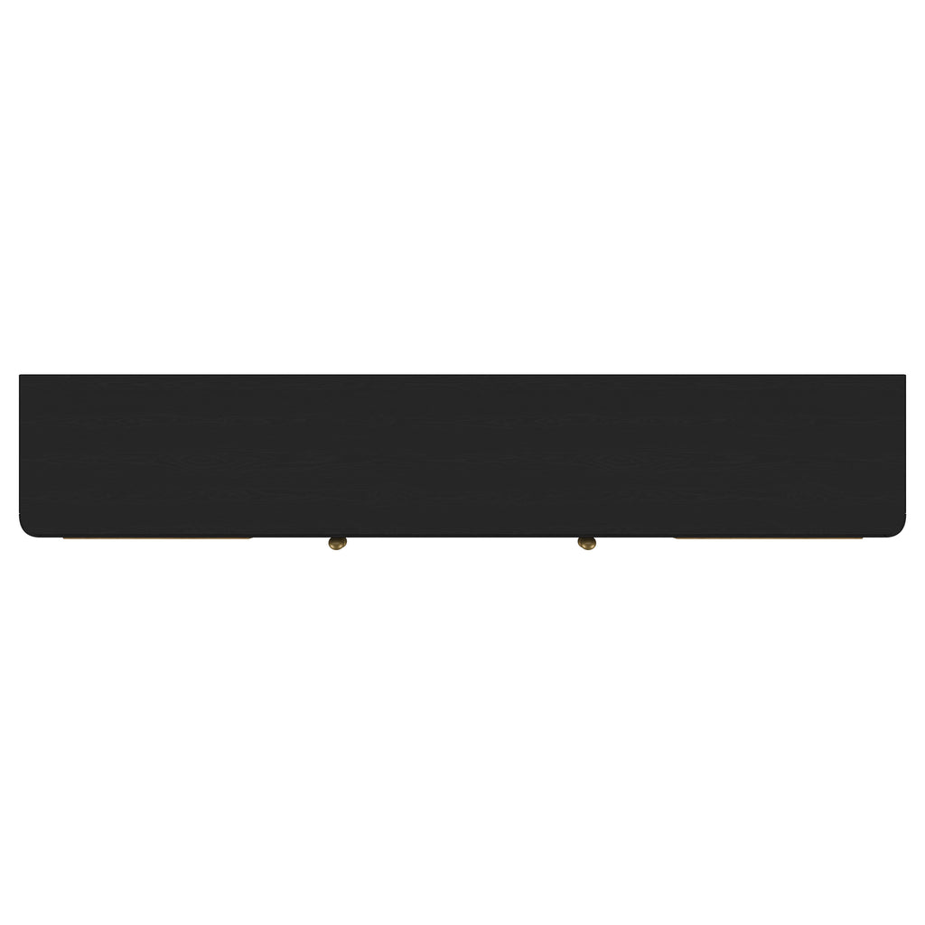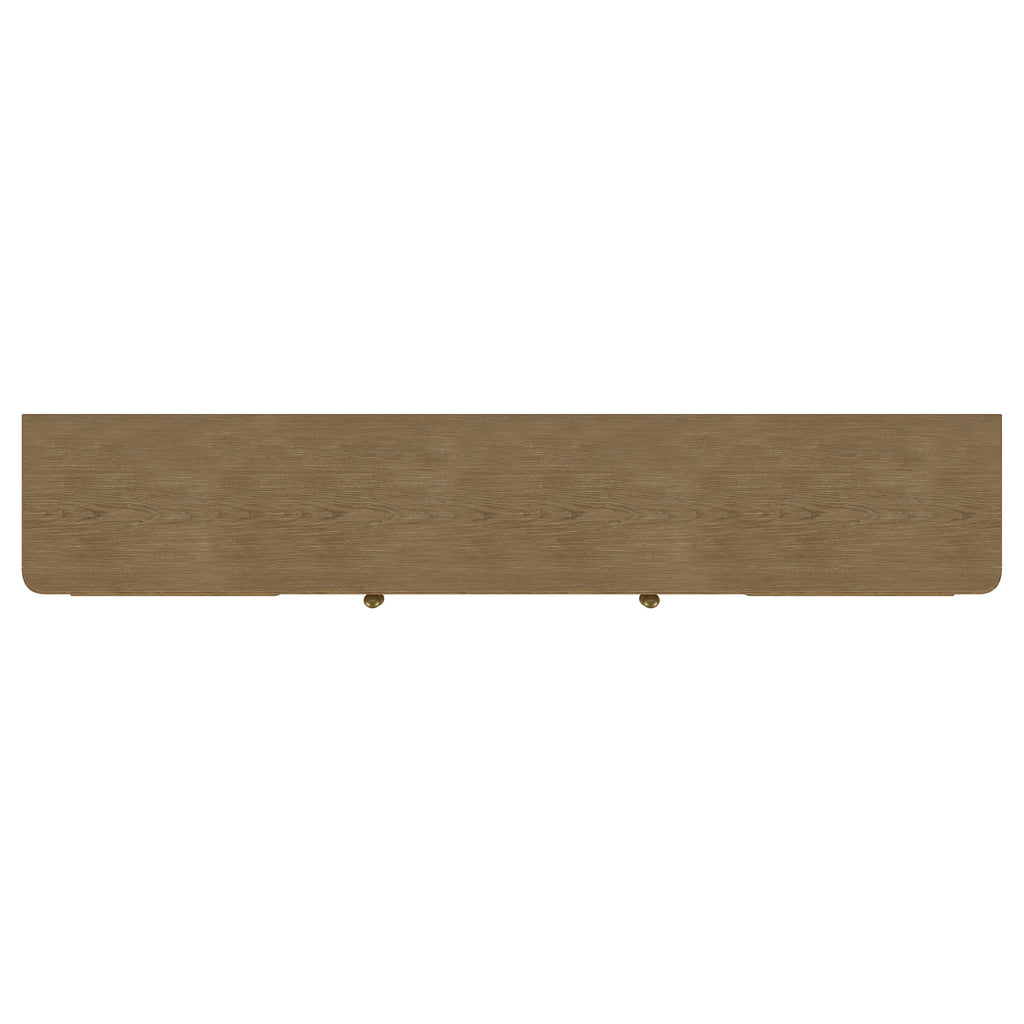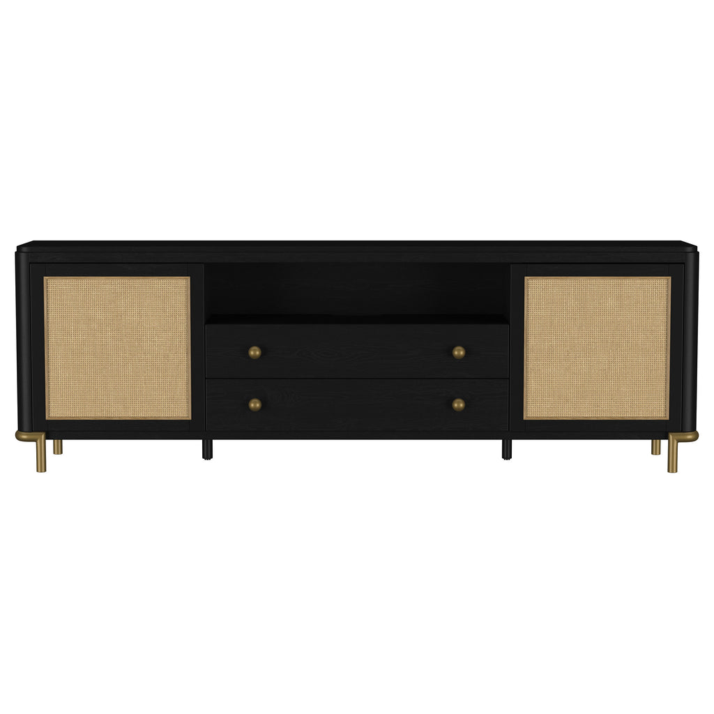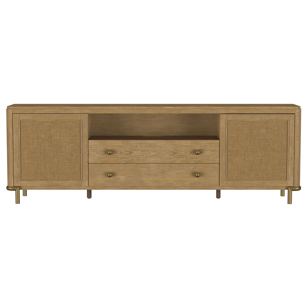 This refined entertainment unit transforms your living room with artisanal detail. Accommodating up to 85-inch displays, this TV stand integrates Asian hardwood, engineered wood, white ash veneer, and rattan. A modern neutral finish and aged brass legs exude timeless appeal. With drawers and hidden storage, it excels as a media console or TV shelf. A versatile TV console and media stand, it ensures an elegant entertainment center and functional media cabinet.