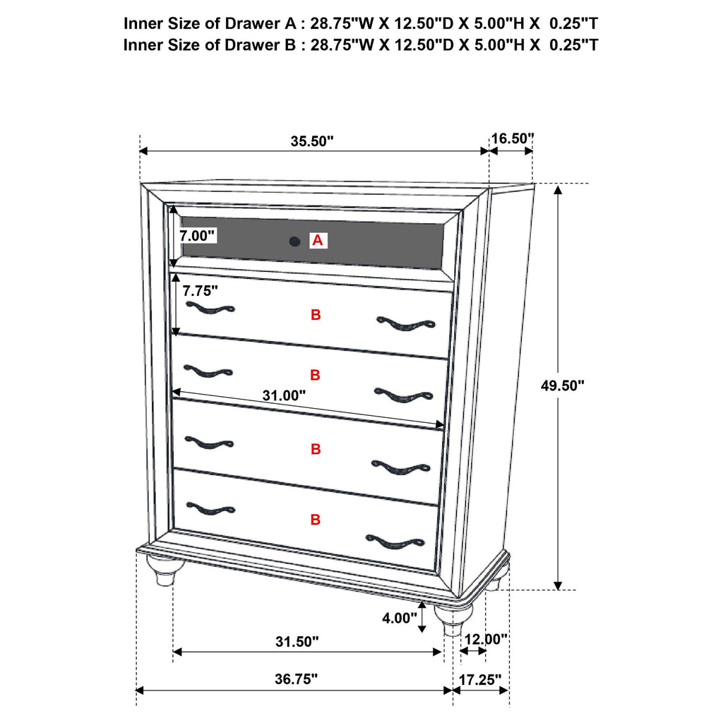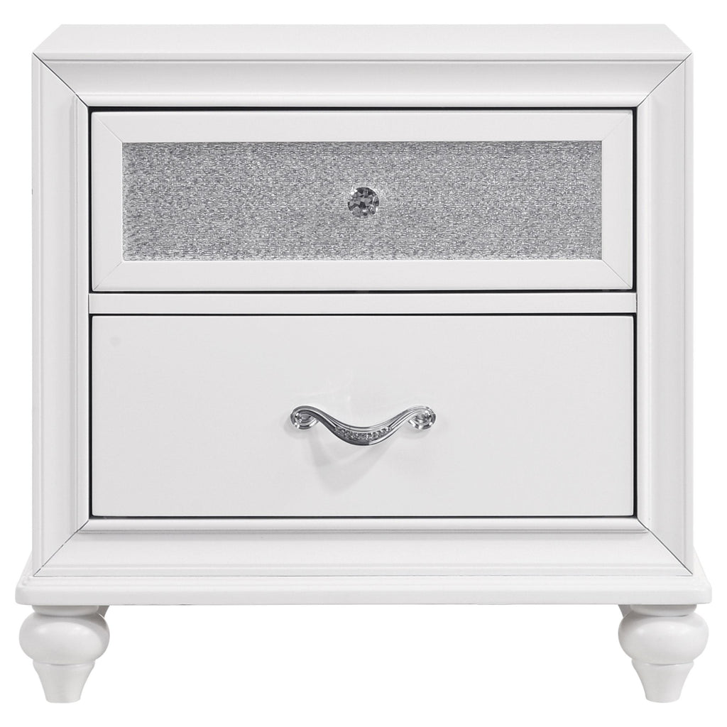 Get ready to add exquisite glamour to your space with this white upholstered bedroom set. The dramatic headboard offers incredible contemporary appeal with velvet upholstery, button tufting, crystal-like accents and hand-applied nailhead trim with a chrome finish. The matching nightstand comes equipped with a crocodile textured door panel and a glimmery chrome top drawer panel. The seven-drawer dresser with mirror and optional five-drawer chest offers the same texture and sparkly finish. Sleek chrome bar pulls perfectly complement the tapered legs on the panel bed and the bun style feet for the storage pieces.