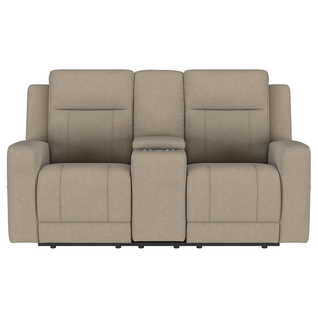 Revamp your living room or den with the inviting comfort of a modern reclining loveseat. Complete with a center console that adds storage and a pair of cupholders, this loveseat is sure to become your favorite on movie nights and game days. It features sleek track arms with modern tufted accents that create impeccable support. Suede-like upholstery has a soft, matte effect, perfect for augmenting with neutral appeal. Add a pair of throw pillows to bring a personal touch to this look.