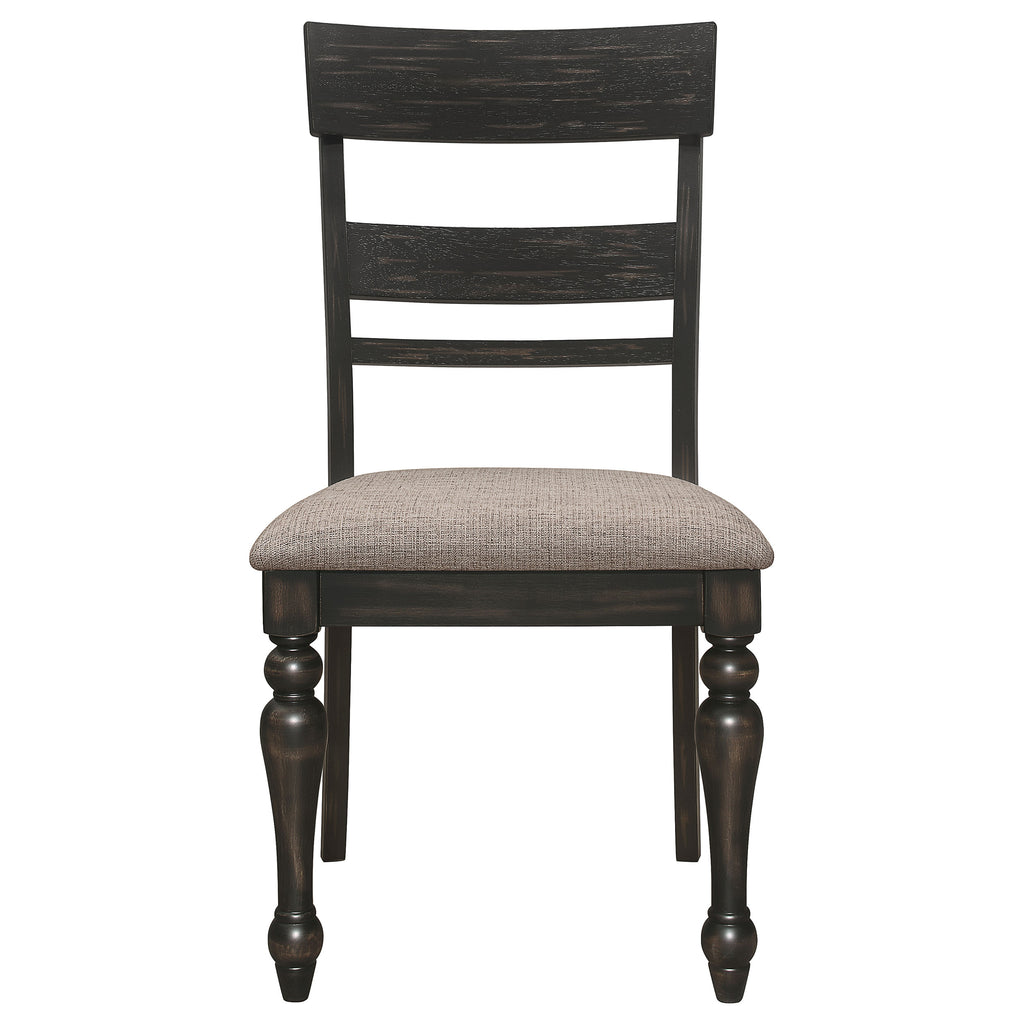 Make your traditional dining area a space for easy conversation and beautiful style. This seven-piece dining set brings out the best in a hybrid aesthetic of farmhouse and mid-century looks with a soft, versatile color and finish palette and construction of Asian hardwoods and wood products. A rectangular table mixes finishes between its brown brushed finish top and a glam charcoal sand through finish base and legs. Curvy lines and turned legs add an alluring feel to a table playing host to brown finish ladderback chairs. A smoothly arched side silhouette with turned front legs creates an elegant look, embellished with neutral and soft stone brown fabric seat upholstery.