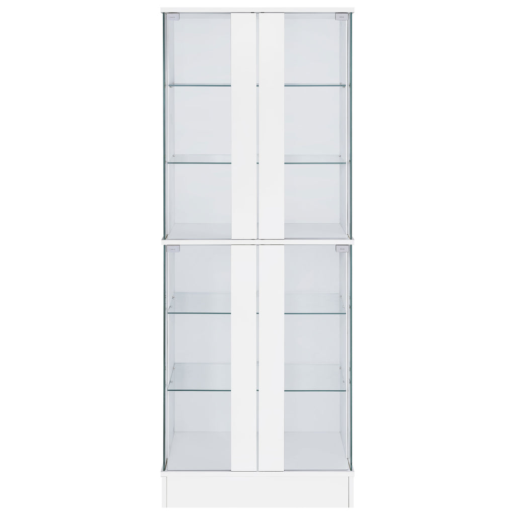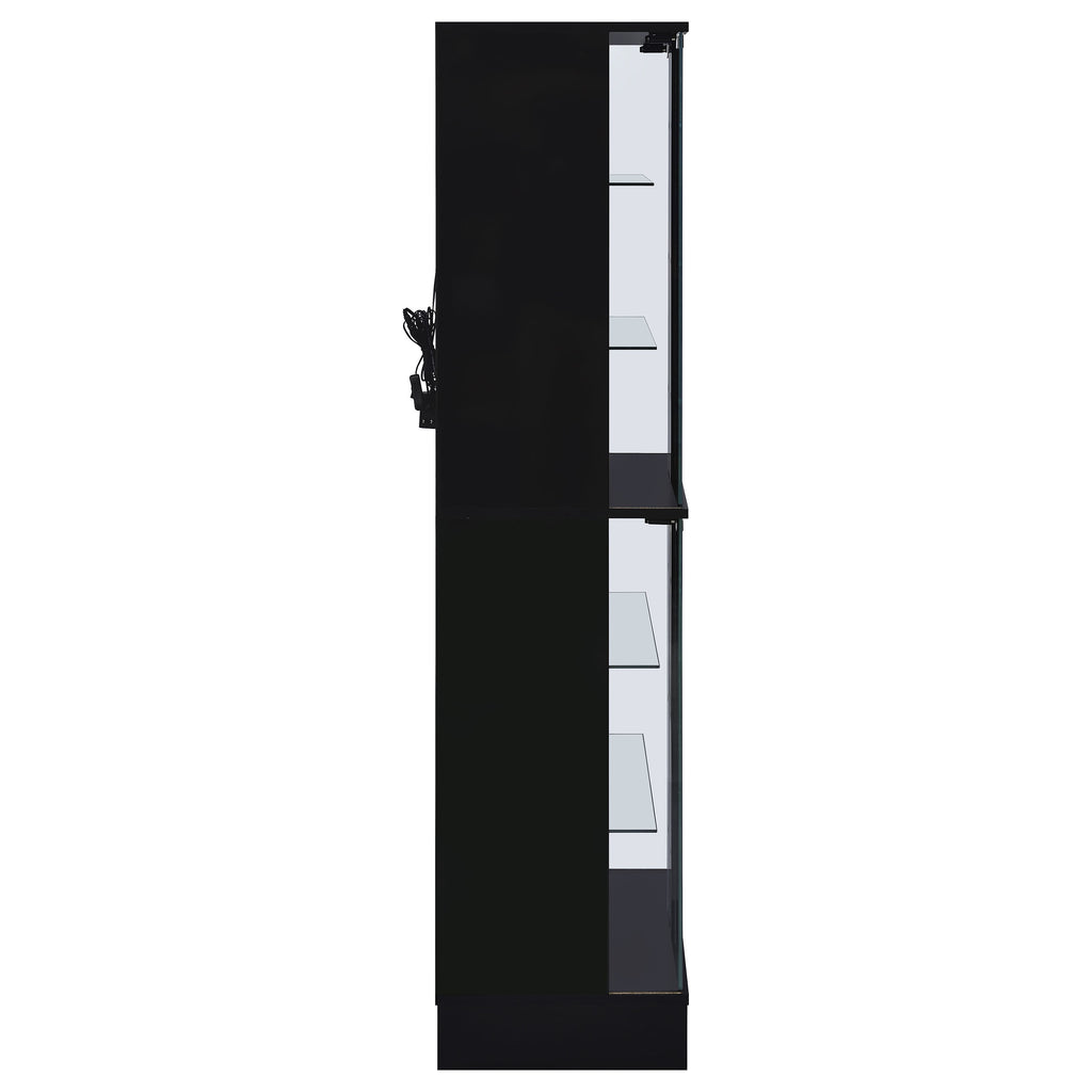 Discover sophistication and functionality fused in this sleek curio display cabinet, a stylish centerpiece for any room. The high gloss laminate on engineered wood gives a luminous sheen, complemented by clear tempered glass doors that encase six tiers of shelving. Each shelf basks in the glow of integrated LED lights, perfect for showcasing your treasures with a touch of modern elegance. The two-door design invites a clear view into your curated collection, while the robust construction promises longevity. This cabinet is not just furniture; it's a statement of refined taste and practical luxury.