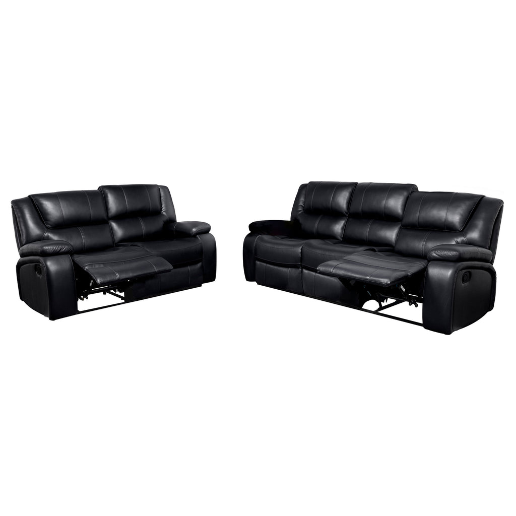 Bold black leatherette upholstery offers the look of luxurious leather with easy-care maintenance as the two-piece motion sofa set is versatile and beautiful. Living rooms, family rooms, and media venues become comfort zones with the plump feel and clean design of a classic sofa and loveseat set built for hours of seating comfort as well as entertaining. Manual reclining is easy and pleasant, allowing a variety of positions for sitting and lounging. Choose this elegant sofa set with pillowy support, as attached seat and back cushions feature plump foam filling with channeling to target body comfort and padded armrests over rounded sides. Entertain in style and sheer comfort with a motion sofa set that’s ideal for lounging and napping.