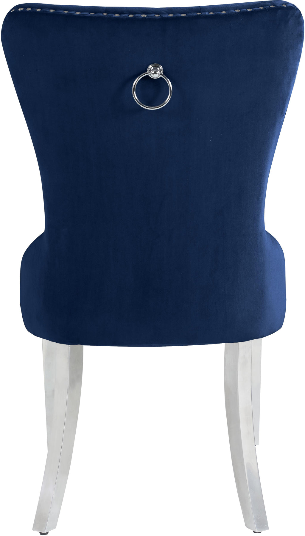 Transform your living space into a chic haven with this Carmen Navy Velvet Dining Chair. This eye-catching high-back chair offers plenty of back support, while its luxurious navy velvet upholstery and deep button tufting provides a soft texture, enabling you to recline in comfort and elegance. Chrome metal legs provide sturdy, durable support, and a matching chrome knocker on the chair's back gives it a unique, stylish touch that adds that extra bit of oomph to your contemporary home.