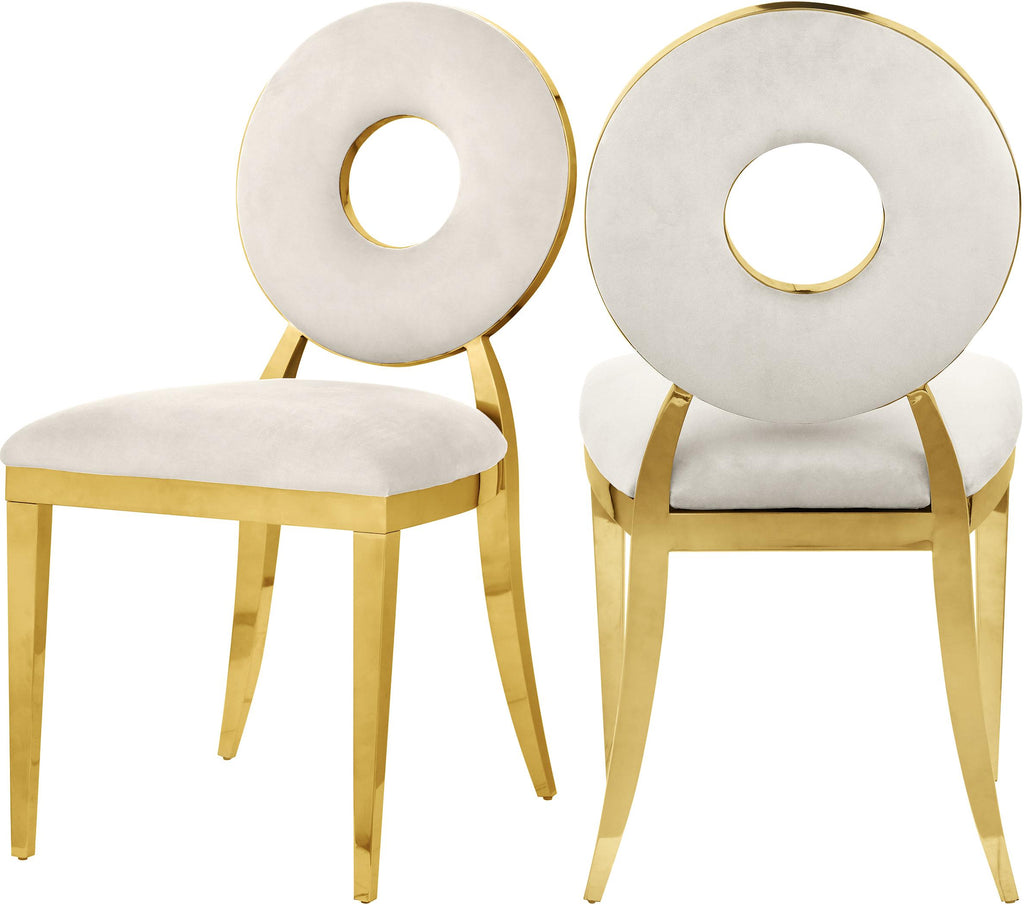 Yield to the decorator within when you bring home this Carousel velvet dining chair. This chair features a metal frame and legs finished in gold stainless steel for a modern touch, but the real star of the show is the donut-shaped seat back that exudes undeniable contemporary charm. The seat and back are both plumply filled for comfort and upholstered in soft cream velvet for a chic look.