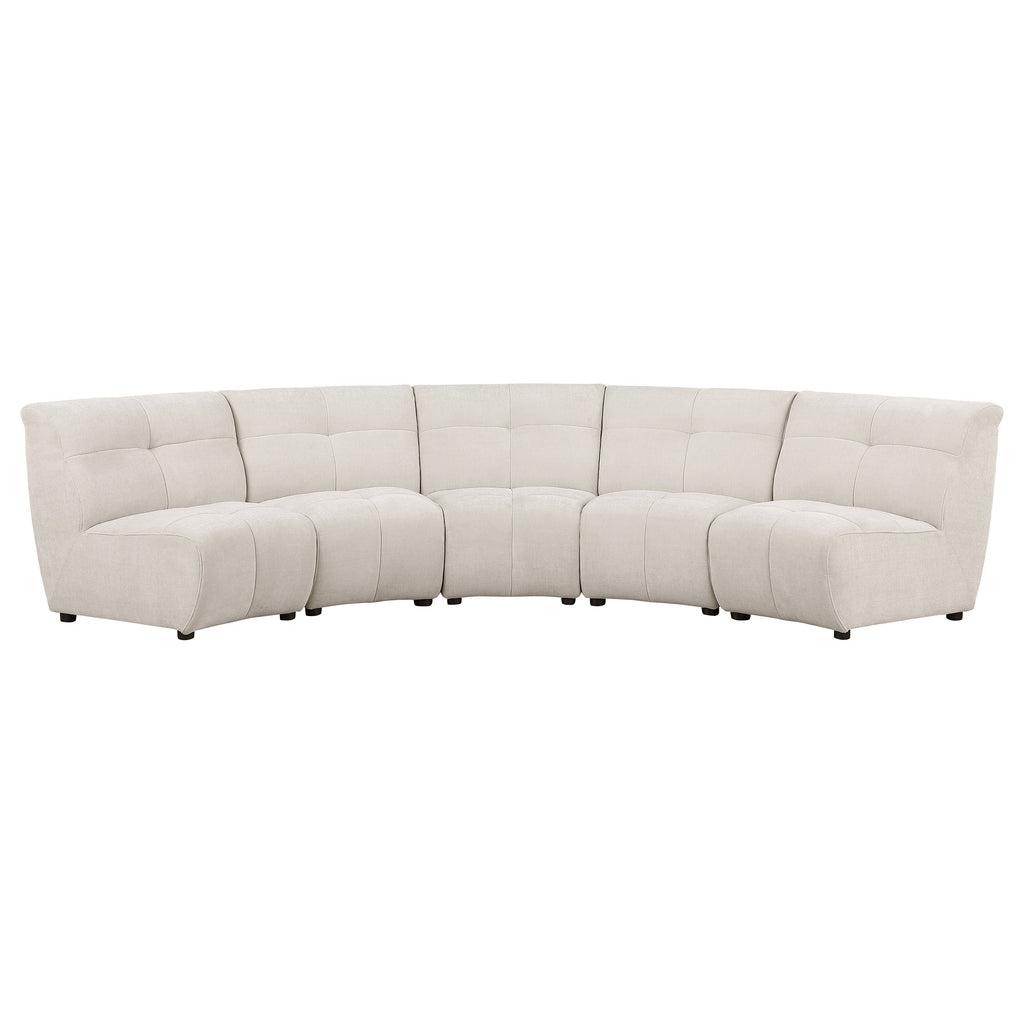 Make a living room or media room the favorite choice for guests and family with an eight-piece sectional sofa with minimalism and sophistication woven into its streamlined design. The sectional sofa cuts to the chase with an ultra-comfortable seating experience and subtly rounded profile, perfect for socializing. Durable ivory fabric is soft and inspiring, lending a versatile element to match or coordinate with surrounding décor. This sectional aligns eight armless pieces for a customized configuration and features contemporary design elements with plump, foam-filled framing and decorative tufting adding dimensionality and classic style. A focal point in any space, the sectional sofa accommodates several visitors and adds a low-key, easy motif.