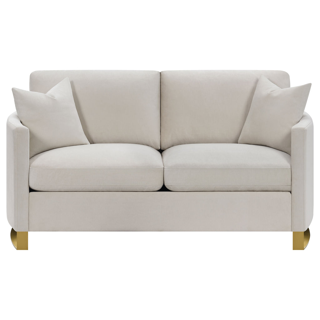 Fresh inspiration marks the start of a stylish, custom room design that begins with this living room set. Modern and contemporary with a softening effect that works in transitional spaces, this set delivers a versatile aesthetic with textured beige velvet upholstery and a surprising twist creating elegance in metal leg units crafted from gorgeous gold stainless steel. Arched sides add character to this set that offers supreme lounging comfort on reversible feather blend cushion seats and sinuous spring deck and webbed backing. Make this set a focal point in a casual, sophisticated space reserved for family and guest entertainment. Includes two accent pillows for each piece.