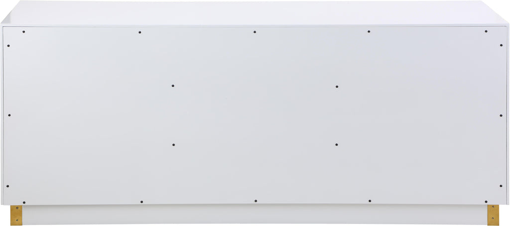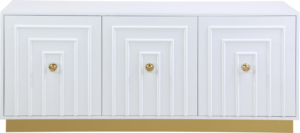 Give your dining room space a bold new look with this Cosmopolitan sideboard buffet. An amazing amount of storage space for china, dishes, serving pieces, and other essentials is only half the story with the Cosmopolitan. This white lacquer-finished sideboard features acrylic and gold hardware and a gold stainless steel base for a look that���s oozing contemporary panache from every angle. Use the top for a makeshift dessert bar after dinner.