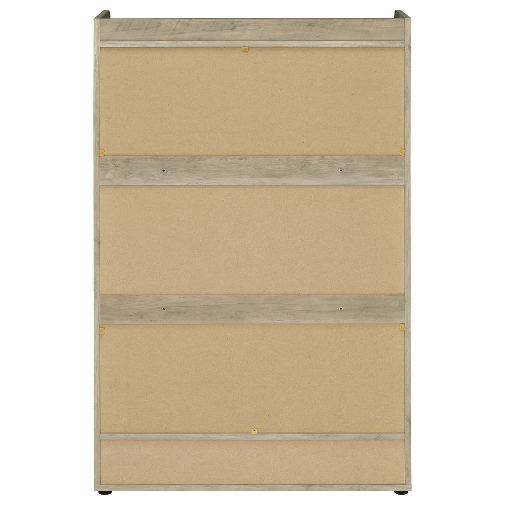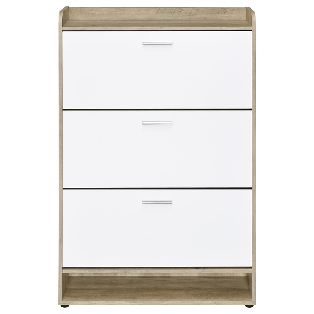 Elevate the organization of your entryway with our dual-tone shoe cabinet, a harmonious blend of practicality and contemporary design. This chic cabinet, crafted from robust engineered wood with a realistic wood-look laminate, offers three tiers of shelving for your footwear, each promising to keep your space clutter-free. The sleek top serves as a perfect perch for your decorative touches or daily essentials, while an additional compartment at the base discreetly takes care of extra storage needs. This cabinet seamlessly adapts to your home's aesthetic, ensuring style and function walk hand in hand.