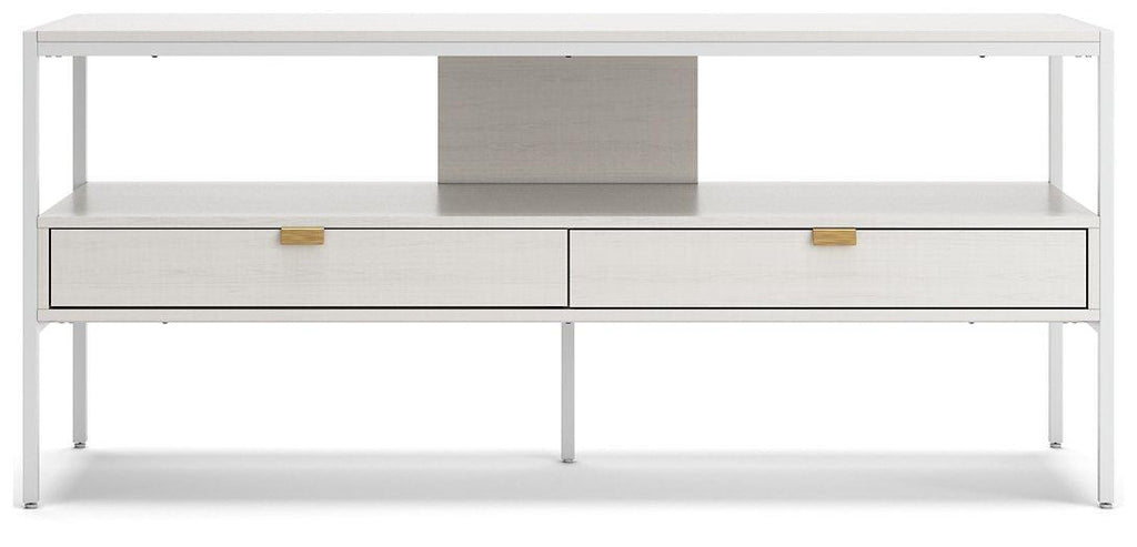 Bring your vision of a modern living room to life with this sleekly designed TV stand. Its linear construction and white finish keep things minimal. An open shelf and two drawers allow you to store in simply streamlined style, rounding out this versatile, striking piece.