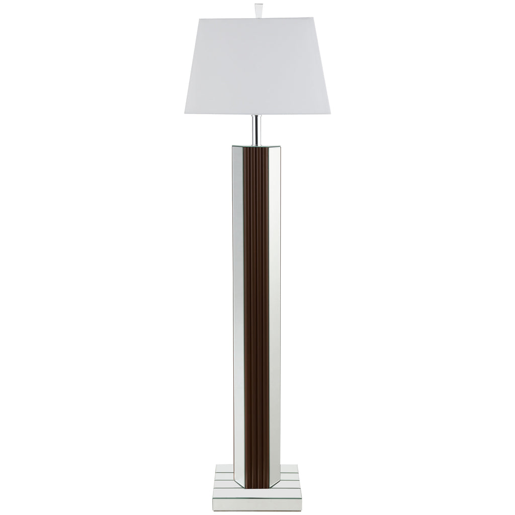 Introduce a dose of character and sophistication with a modern floor lamp. It boasts a chic towering silhouette, complete with a deep brown finish and scallop details that create a fresh touch of texture and dimension. Mirrored panels add contrast and bright reflectivity, while a mirrored base creates a sense of cohesion. The light bulb is an energy efficient 9-watt LED, creating warm illumination for tasks and ambiance. An angular shade completes the look with white fabric, offering timeless character to a compelling silhouette.
