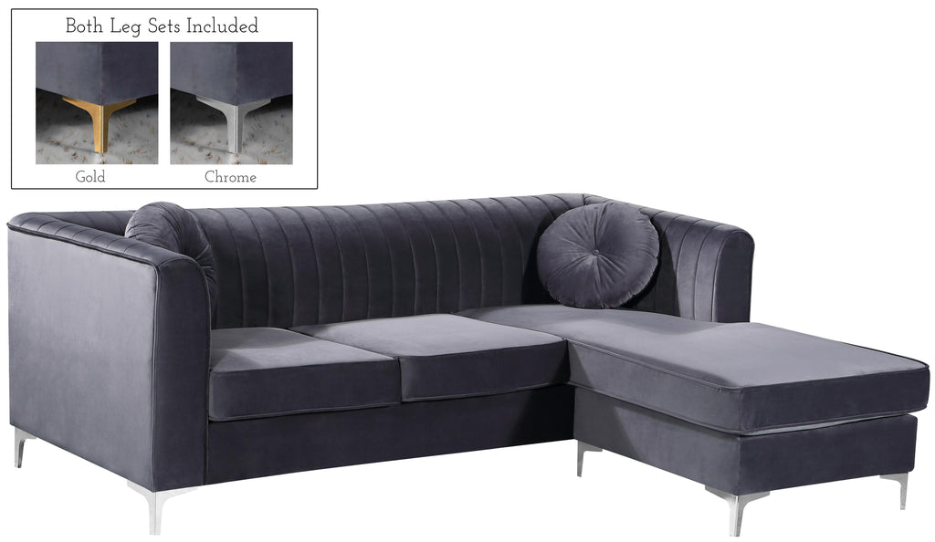 Spend your evenings lounging on this Eliana Grey Velvet 2pc. Reversible Sectional. This sectional has a chaise end to give you lots of legroom during your nap, and its elegantly plush velvet upholstery ensures it feels luxurious to the touch. The grey velvet color is exciting and fun and lends a touch of boldness to otherwise neutral decor or other furnishings in your space. A channel-tufted back adds to its durability and prevents cushion shifting. Both legs are included so use it with the chrome legs or gold legs, it's your choice!