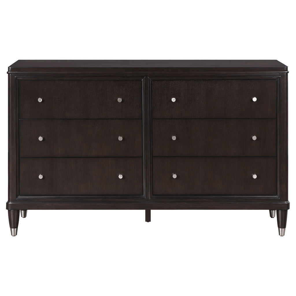 Introduce stylish storage in your bedroom with a modern six-drawer dresser. Its sleek look is accentuated in a dark brown finish, with metallic accents that add depth to tapering feel. Petite knobs decorate each drawer front as drawers offer ample storage for clothing, linens and accessories in your bedroom. The dresser offers a wide top for decor and drawers add protection with felt lining in top drawer and cedar lining and bottom drawers. Add framed photos or a metal sculptural piece to the top of the dresser to add a personal touch.