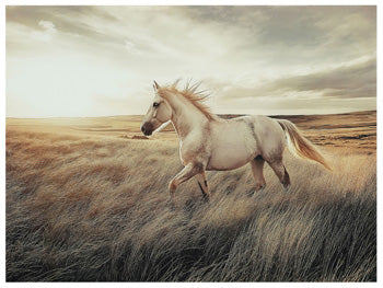This wall art brings serene beauty to your home. This captivating print on glass captures the grace and majesty of a wild horse galloping through a golden field. The warm, earthy tones and dynamic composition create a sense of freedom and movement. It's a perfect choice to enhance your wall decor with nature-inspired artistry.