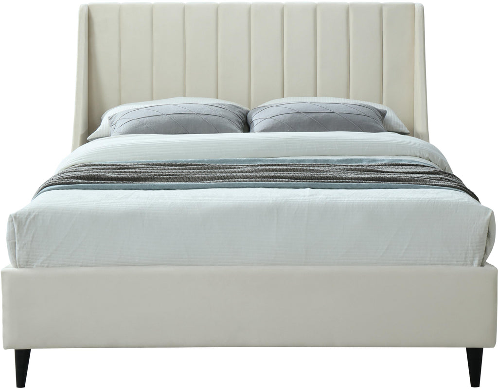 Snuggle up to a pet or other loved one in this richly upholstered Eva cream velvet king size bed for the ultimate in rest and relaxation. The wing back headboard has cushioned vertical deep channel tufting, and both the side rails and footboard are upholstered too for your comfort. Tapered black wood legs match the upholstery and support this contemporary bed, elevating it sufficiently that you can store items underneath.