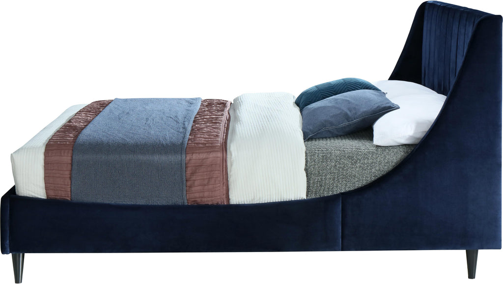 Snuggle up to a pet or other loved one in this richly upholstered Eva navy velvet king size bed for the ultimate in rest and relaxation. The wing back headboard has cushioned vertical deep channel tufting, and both the side rails and footboard are upholstered too for your comfort. Tapered black wood legs match the upholstery and support this contemporary bed, elevating it sufficiently that you can store items underneath.