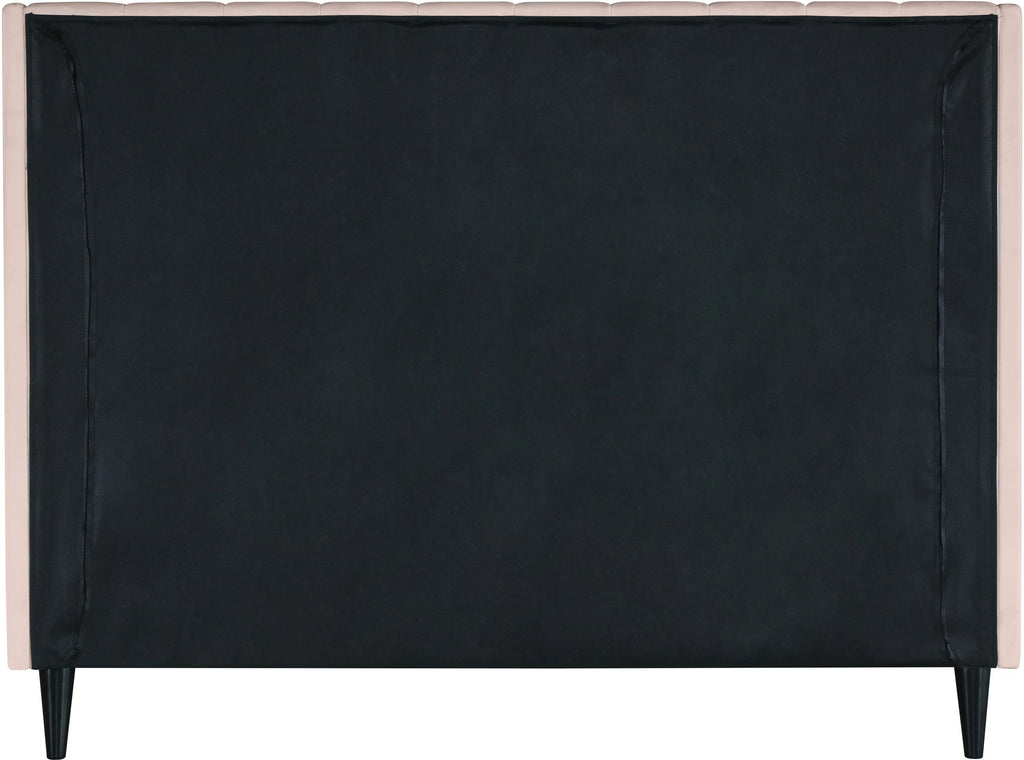 Snuggle up to a pet or other loved one in this richly upholstered Eva pink velvet queen size bed for the ultimate in rest and relaxation. The wing back headboard has cushioned vertical deep channel tufting, and both the side rails and footboard are upholstered too for your comfort. Tapered black wood legs match the upholstery and support this contemporary bed, elevating it sufficiently that you can store items underneath.