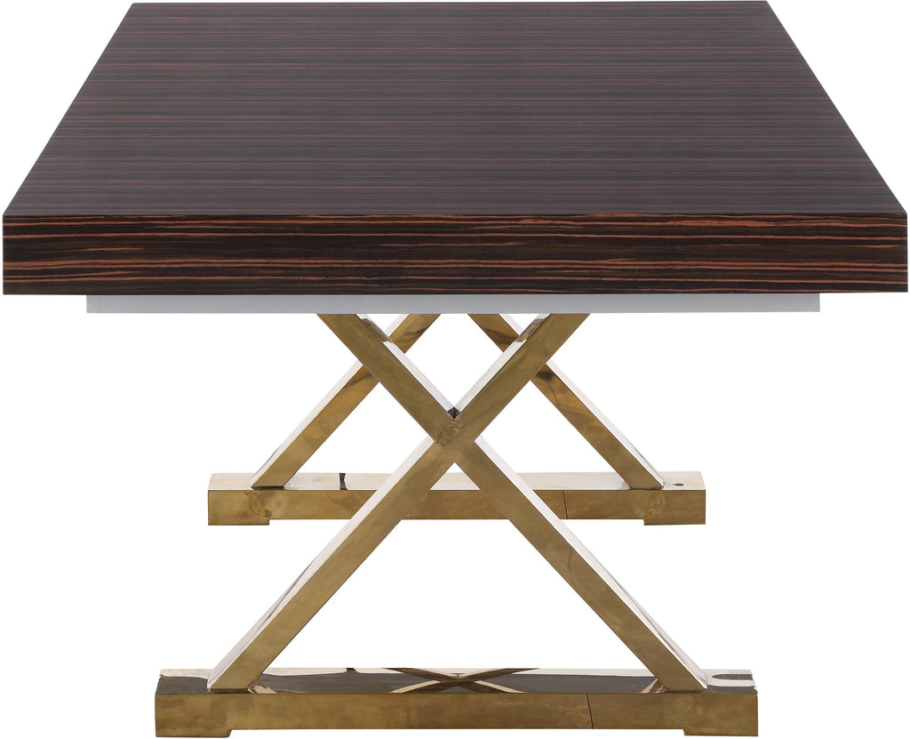 Make room for the whole gang around this Excel extendable two-leaf dining table featuring a rich brown zebra wood veneer lacquer top and gold stainless steel base. This handsome table is sized just right for family-sized get-togethers, with its extra-long top and oversized design that offers loads of leg room for guests. Inverted X-style legs lend this table a charming look, while the two included leaves make it easy to extend the table or make it smaller for more intimate get-togethers.