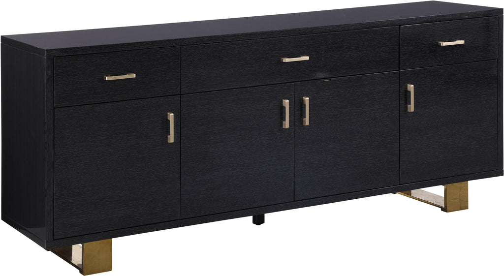 Organize flatware and silverware in the three spacious drawers of this Excel sideboard buffet. This beefy sideboard offers room aplenty for holding things you need in the dining room���out of sight and out of mind. The rich grey oak veneer lacquer finish with gold base and handles gives this unit the modern panache needed to mesh with nearly any contemporary dining set. Wood and stainless steel construction ensures lasting beauty and long-lived performance.