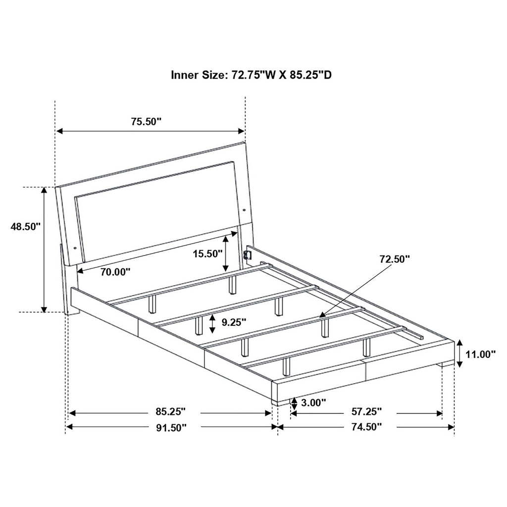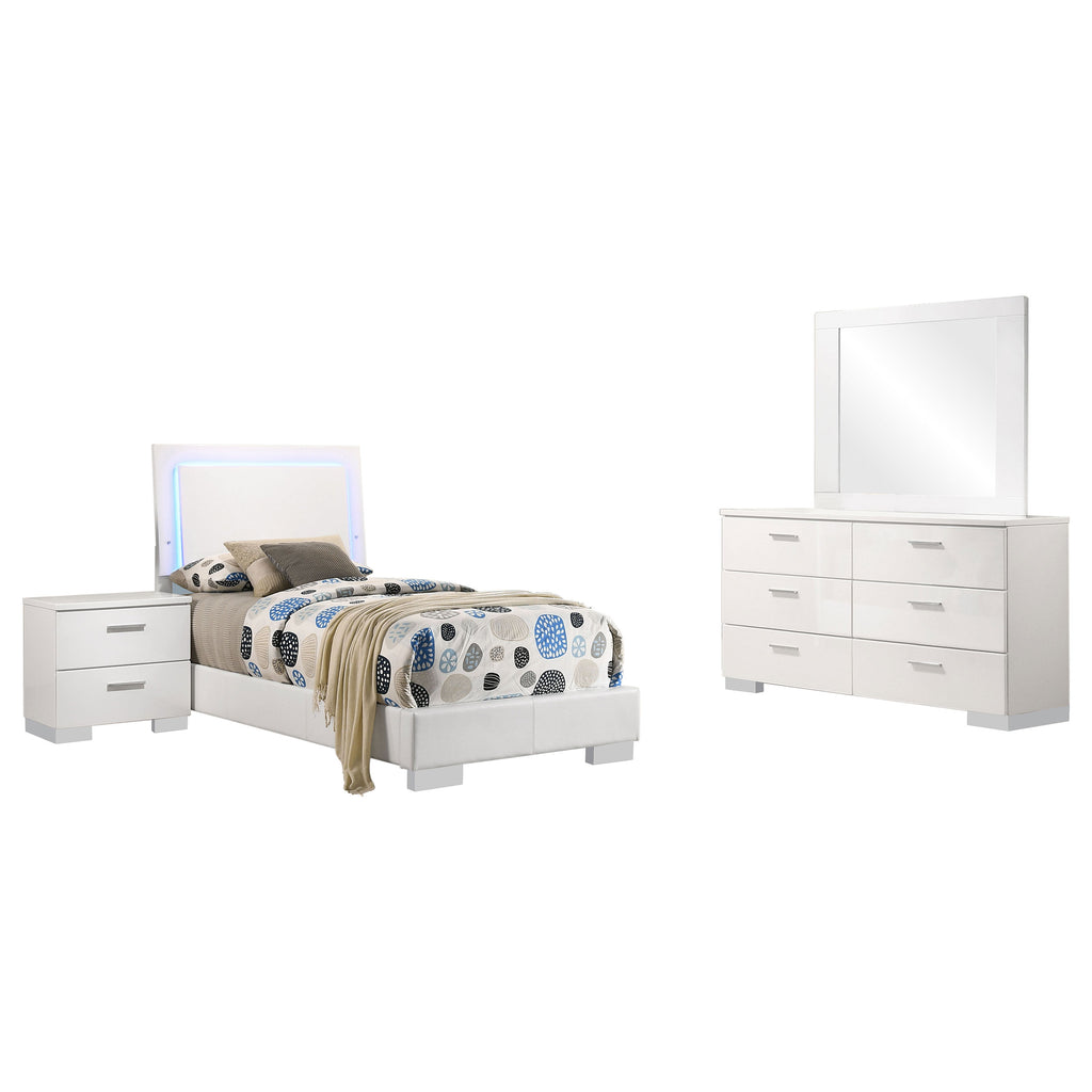 Sleek lines and integrated lighting define this contemporary bedroom set. The bed showcases a white high gloss headboard with built-in blue LED lighting, activated by a touch switch, and a faux leather upholstered frame for added refinement. Paired with a coordinating dresser mirror featuring perimeter LED lights and a touch sensor, the set balances utility with clean, modern design. Chrome hardware and smooth-glide drawers complete the polished look.