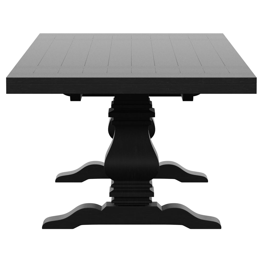 This rectangular extension dining table blends classic European elegance with artisan craftsmanship. Crafted from solid pine, it features a double pedestal trestle base that exudes romantic charm and timeless character. The sculpted pedestals, connected by a wide plank accent, create a striking focal point with an authentic handcrafted feel. A planked tabletop enhances its rustic appeal, while two 16-inch removable leaves extend the table up to 126 inches, making it perfect for gatherings large and small. Built for both beauty and durability, this table is an inviting centerpiece for any dining space.