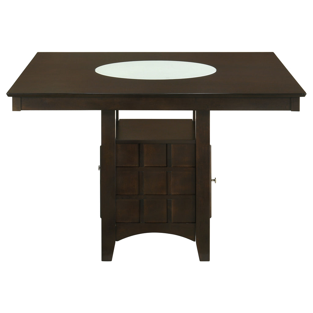 Appreciate the texture and dimension created with gris lattice details in a charming five-piece transitional counter height dining set. A rich cappuccino finish pairs with soft tan upholstery to create a neutral palette, perfect for creating a warm and welcoming ambiance in your kitchen or dining room. The set centers on a square dining table that includes a lower shelf and cabinet, offering multifunctional appeal that maximizes space utilization. The cabinet includes stemware and bottle storage to keep favorite vintages at your fingertips while enjoying delicious meals with friends and family. Chairs includes full backs and footrests for excellent support and comfort, while the open cube design lightens the overall look while ensuring rich dimensionality.