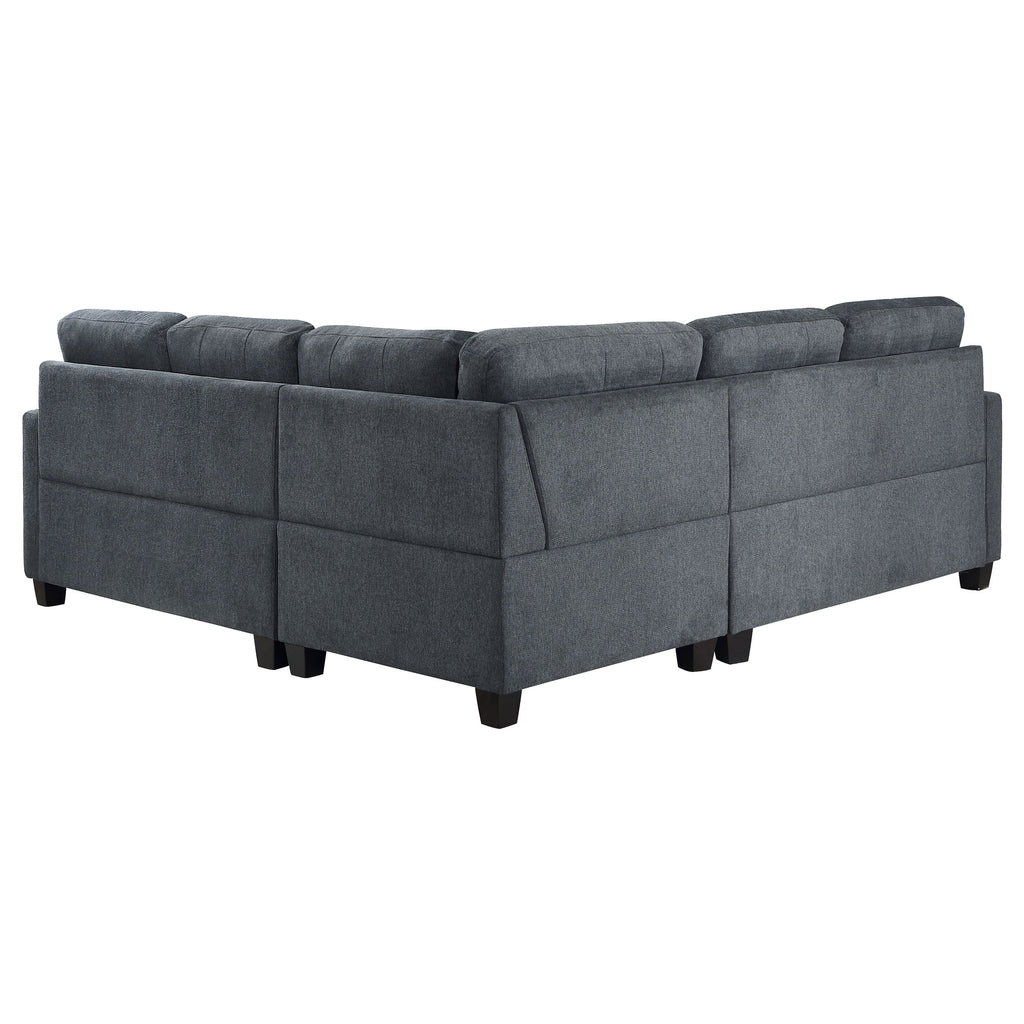 Entertaining is a breeze with a transitional style motif as the sectional set assembles pieces forming an L-shaped sofa, ideal for family rooms and media venues. Classic design elements are pleasing, as wood framing forms a straight box base and slender track arms. Gorgeous fabric upholstery opens up options for blending with room color palettes. Sit in relative luxury on foam-padded attached seat cushions and against reversible back cushions, all with subtle tufting. Chunky wood feet deliver a fun iconic embellishment to a set that includes one corner chair, one left-facing loveseat, and one right-facing loveseat.