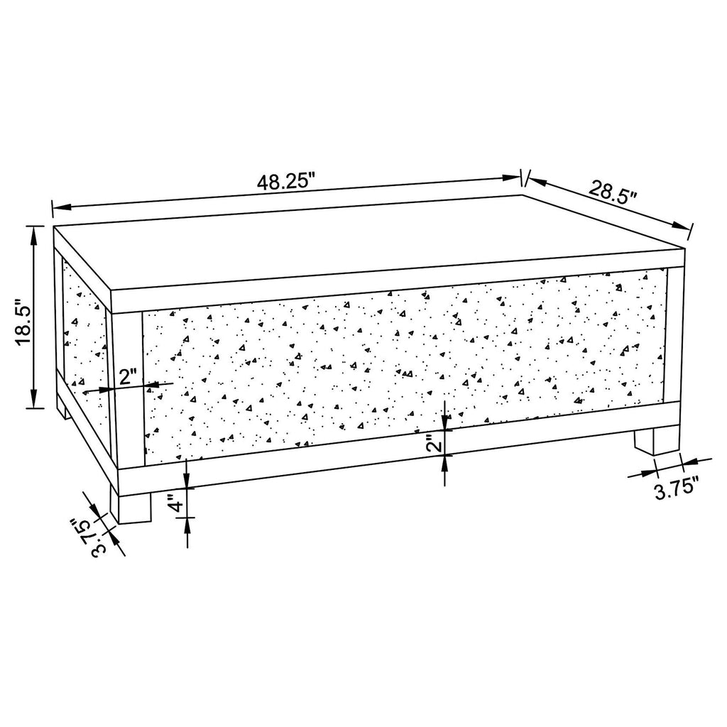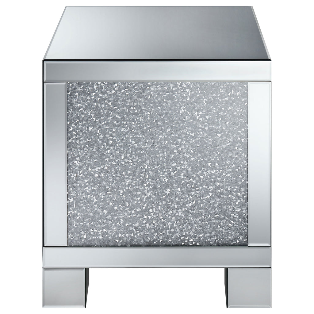 This glam mirrored coffee table set with a 48-inch rectangular coffee table and 20-inch square end table, combining style with practicality. Pieces feature engineered wood frames, fully mirrored surfaces, and dazzling acrylic crystal accents. The sleek designs and reflective finishes add light, dimension, and a luxurious glam vibe to contemporary interiors.