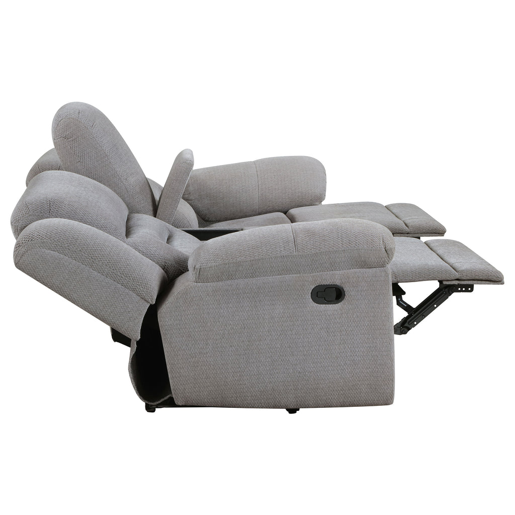 Enhance your living space with the ultimate comfort of our manual reclining loveseat, designed for a relaxed and laid-back approach to seating. This loveseat features soft textured grey chenille fabric, providing a plush and inviting feel. The manual recline feature allows you to easily adjust your seating position for optimal comfort, making it perfect for watching TV, reading, or simply relaxing. With removable stainless steel cup holders and a convenient soft-close storage compartment, this loveseat combines functionality with style. The pillow top arm supports add an extra layer of comfort, ensuring a cozy and enjoyable seating experience.