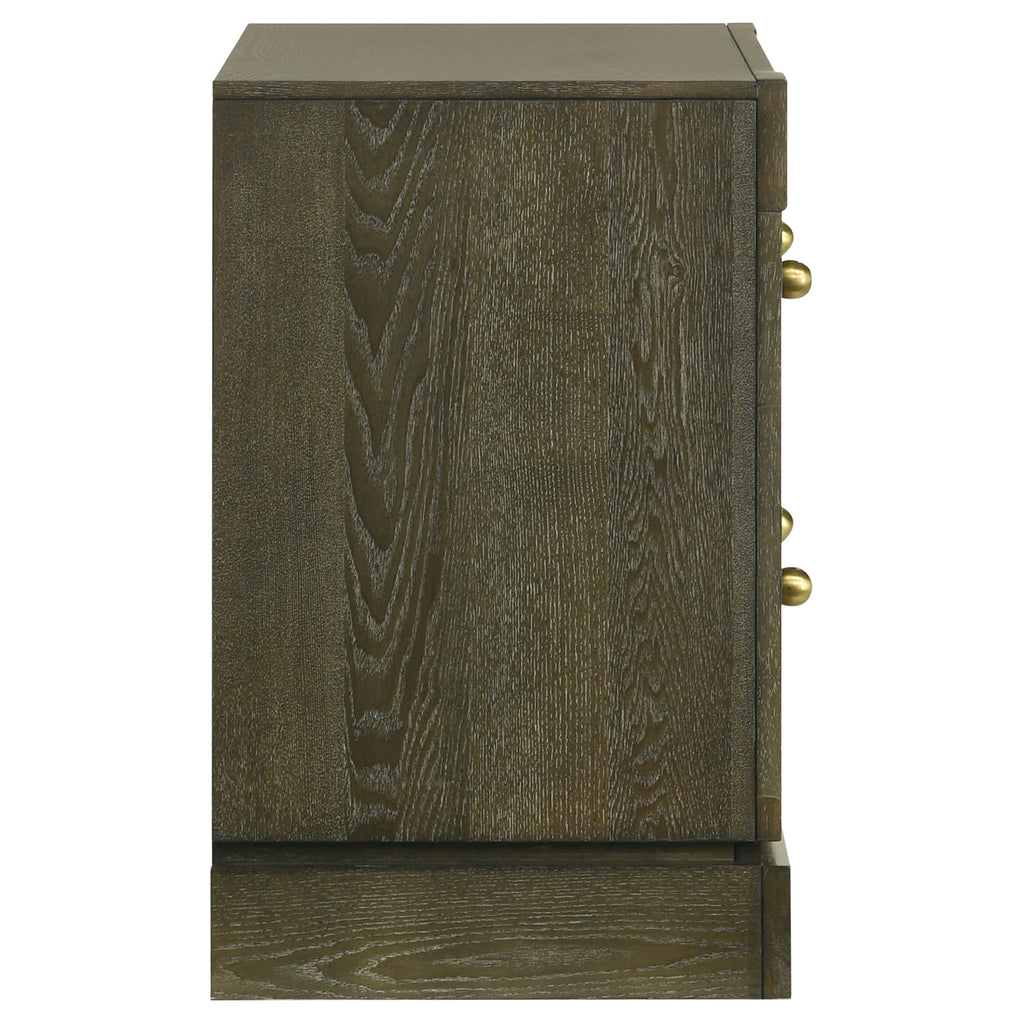 Elevate your bedside with this stylish nightstand, combining transitional design with practical functionality. Finished in dark cocoa with brass knobs, this nightstand features a solid wood drawer box with English dovetail joinery and 45mm metal ball-bearing glides for smooth operation. The top drawer is felt-lined and includes cord management access for your rechargeables. Crafted from solid hardwood, ash veneer, and MDF, this nightstand offers both elegance and durability.