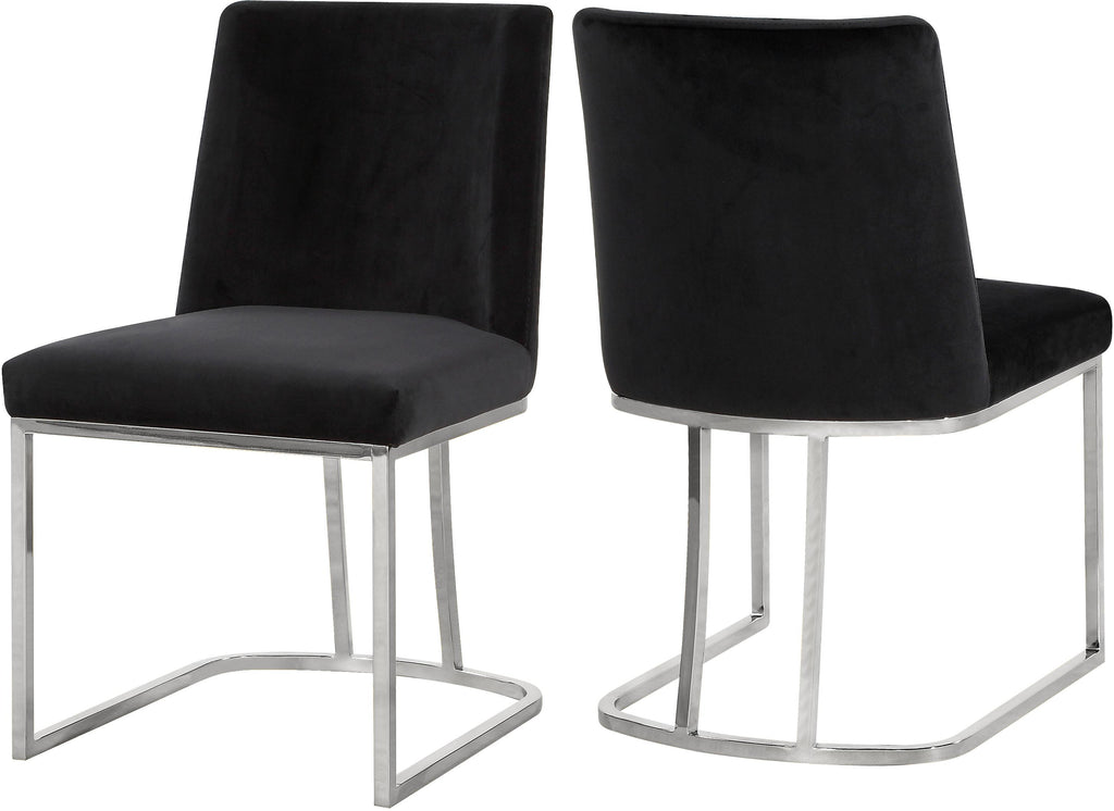 Lend your dining room a Hollywood-inspired vibe with this chic Heidi Black Velvet Dining Chair. This pretty chair features velvety smooth upholstery on its back and seat cushions to comfort and pamper guests while they enjoy their meals. The black velvet and chrome metal combination ensures that you make a big statement in your space. The metal frame has a polished chrome finish that adds to the lavish look of this armless chair.
