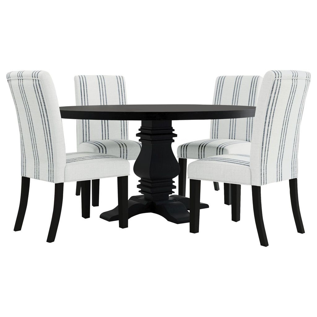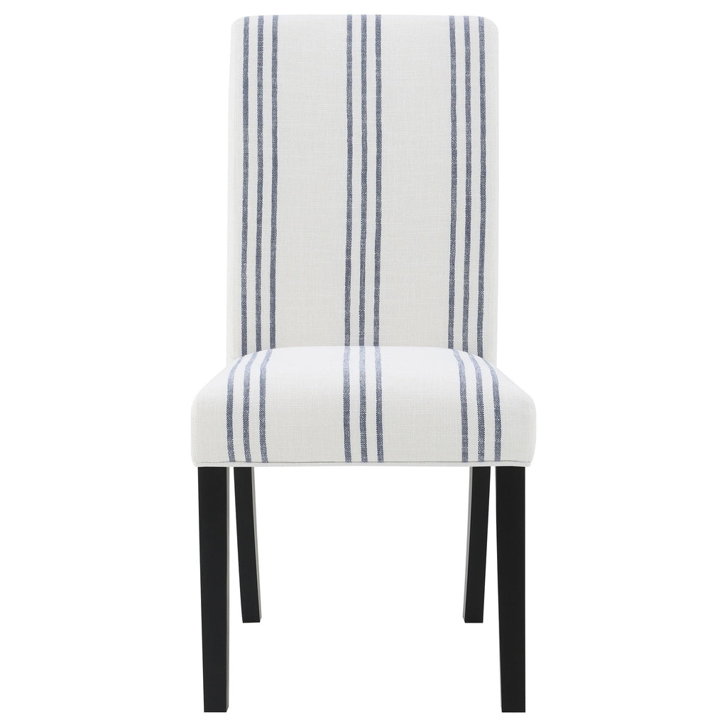 This dining chair blends casual elegance with functional comfort, making it a versatile addition to dining spaces. Upholstered in a linen-like beige fabric with subtle blue stripes, it adds a relaxed yet refined aesthetic. The chair features a padded seat and backrest, ensuring comfort during meals or gatherings. Supported by a sturdy Asian hardwood frame with a sleek black finish, the design balances durability and style. Perfect for modern, farmhouse, or transitional decor styles.