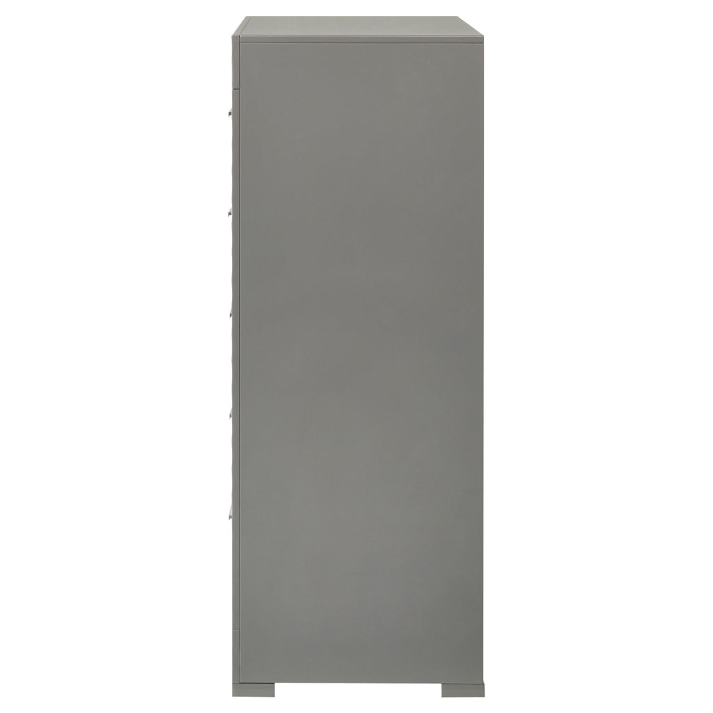 Organize your wardrobe in style with this contemporary chest. The high gloss finish and 3-dimensional diamond tile emboss provide a chic, modern look that enhances any bedroom decor. Five spacious drawers offer ample storage for clothing and linens, each with felt lining in the top drawers to protect your delicate items. The chest is built with robust materials and Pin construction joinery, ensuring durability and smooth functionality. This piece is both practical and stylish, perfect for a modern home.