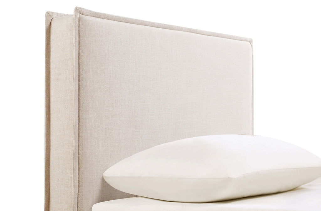 Inspire modern artistry in a contemporary bedroom space with a headboard that shines as a focal point. This updated headboard creates a mix of clean lines and tempting upgrades to transform a bedroom into a haven for relaxation. Versatile and timeless, flange details dress up the outer border, adding a dimensional effect. Textured sand finish fabric wraps over the headboard to deliver a light essence and a palette that accommodates a variety of options for matching case pieces, beds, and accessories. Constructed of pine wood.