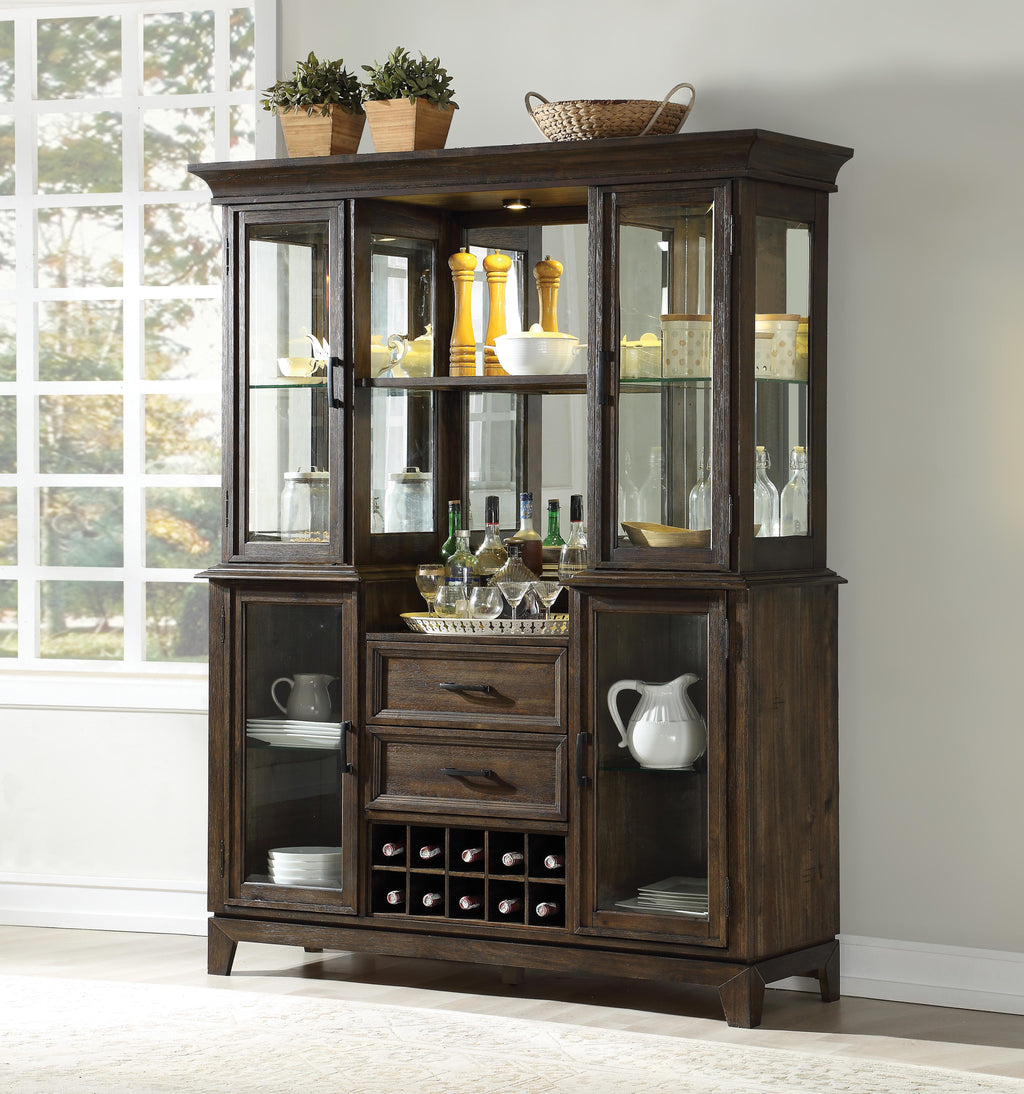 ACME Jameson Hutch & Buffet, Espresso (1Set/2Ctn), 58" x 19" x 77"H, 335Lbs. Update your space with the stylish Jameson dining room collection. This formal group combines the look of rich espresso with the understated styling of traditional design. Brown undertones play to the look of the rectangular dining table with removable leaf. The trestle base with double pedestals add perfectly to the table-s trend forward style. Adding the hutch and buffet to complete its trend forward style. Materials: Wood
