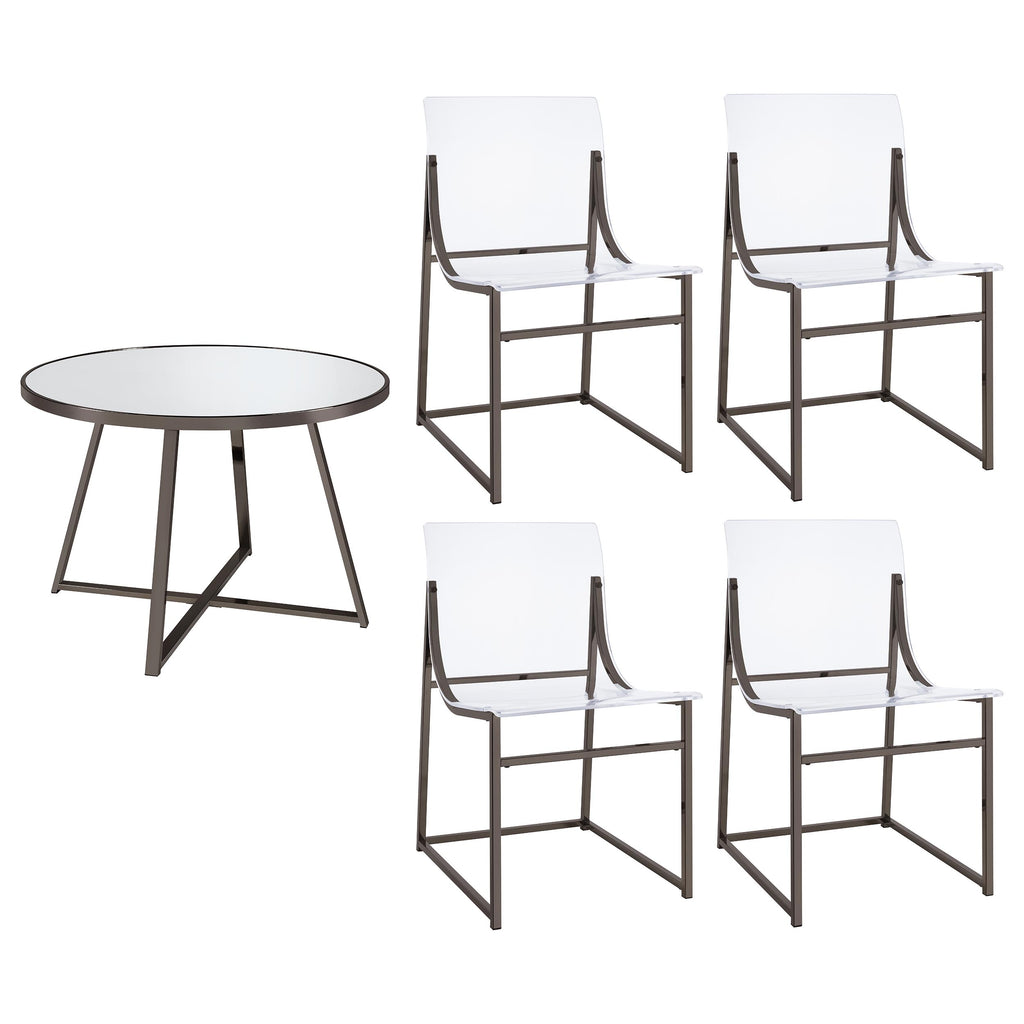 Elevate your dining experience with this striking five-piece dining set, blending contemporary design with modern elegance. The centerpiece is a round dining table, featuring a sleek mirror glass tabletop and supported by angular, open frame legs that add a touch of geometric flair. Complementing the table are four avant-garde dining chairs that redefine modern style with their clear acrylic backs and minimalist metal frames. The black nickel finish of the table and chairs enhances the set's sophisticated appeal, making it perfect for both casual meals and elegant entertaining. Whether hosting dinner parties or enjoying a quiet meal, this dining set transforms your space into a chic dining oasis.