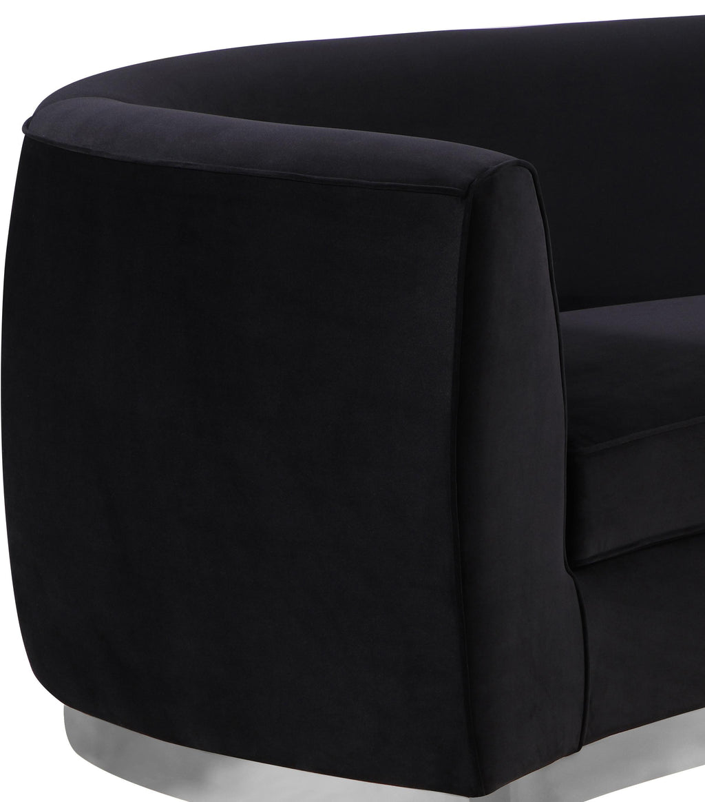 The perfect mix of black velvet and gold stainless steel comes to life in your space with this Julian Black Velvet Loveseat. This bold black velvet loveseat comes upholstered in rich, sumptuous-to-the-touch velvet to make a fashionable statement in your space. The curved back design lends it a modish touch, and the gold stainless steel trim around its base adds to its glitzy appeal. Stage this loveseat alone or with other pieces in the Julian collection.