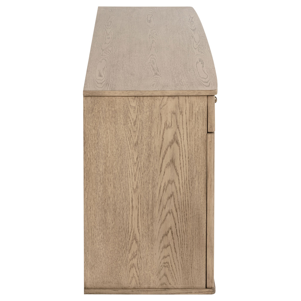 Transform your dining area with this exquisite dining set, featuring a spacious dining table, handcrafted dining chairs, and a beautifully designed sideboard cabinet. The table, made from solid wood, engineered wood, and oak veneer, offers a smooth rectangular top with an 18-inch extension leaf, providing ample space for up to 8 guests. Each dining chair is crafted with a natural wood frame, hand-woven radio weave cane backrest, and a foam seat cushion upholstered in beige fabric, ensuring both style and comfort. The standout of the set, the matching buffet, features ample storage with three spacious drawers and three cabinet compartments behind four doors, perfect for organizing dinnerware, linens, or other essentials. With its cohesive blend of craftsmanship, durability, and natural beauty, this dining set is perfect for creating a welcoming and stylish space for any occasion.