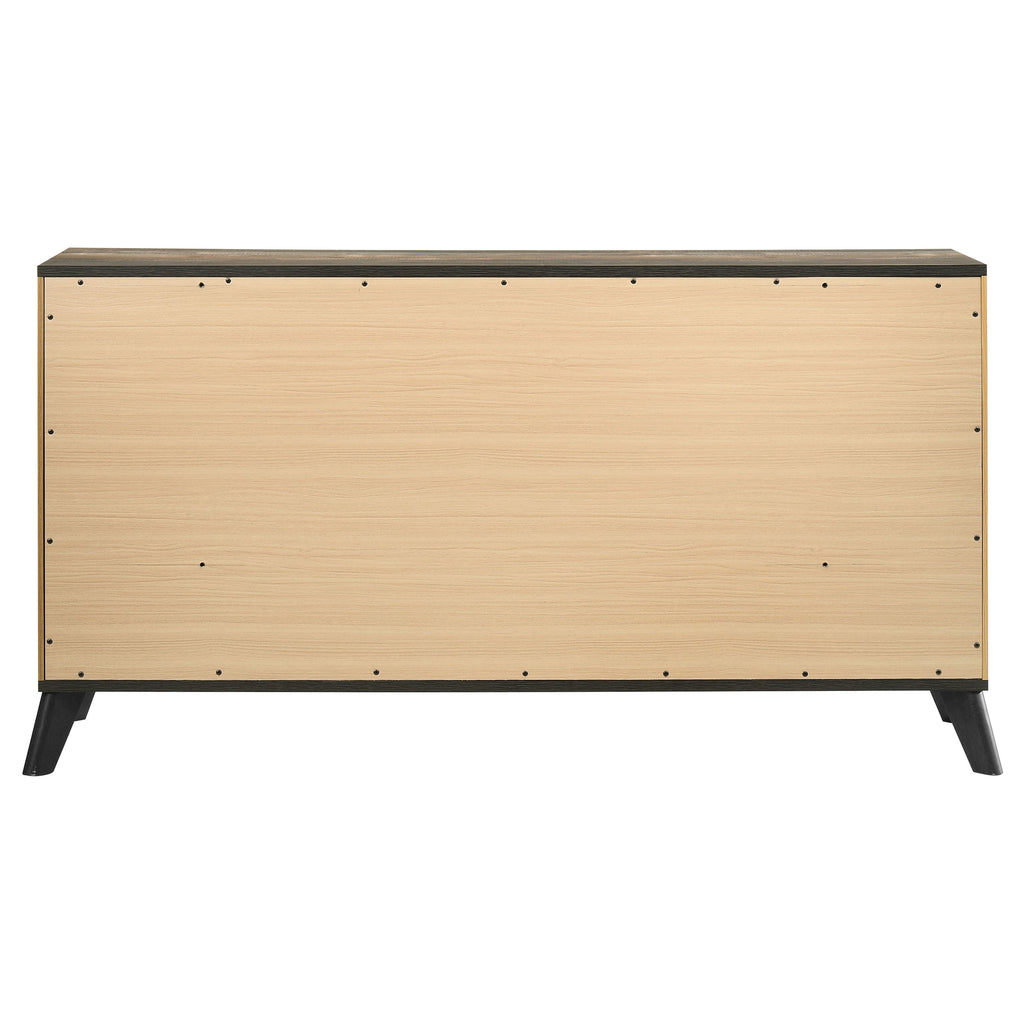Add a touch of elegance to your bedroom with this spacious dresser, combining mid-century modern design with a rustic wood grain effect. The weathered brown and natural pine finish is beautifully complemented by matte black finished metal pull handles. Crafted from engineered 3D paper veneer and featuring English dovetail drawer joinery, this dresser offers durability and style. The center metal drawer glides ensure smooth operation, while the ample storage space keeps your essentials organized and easily accessible.