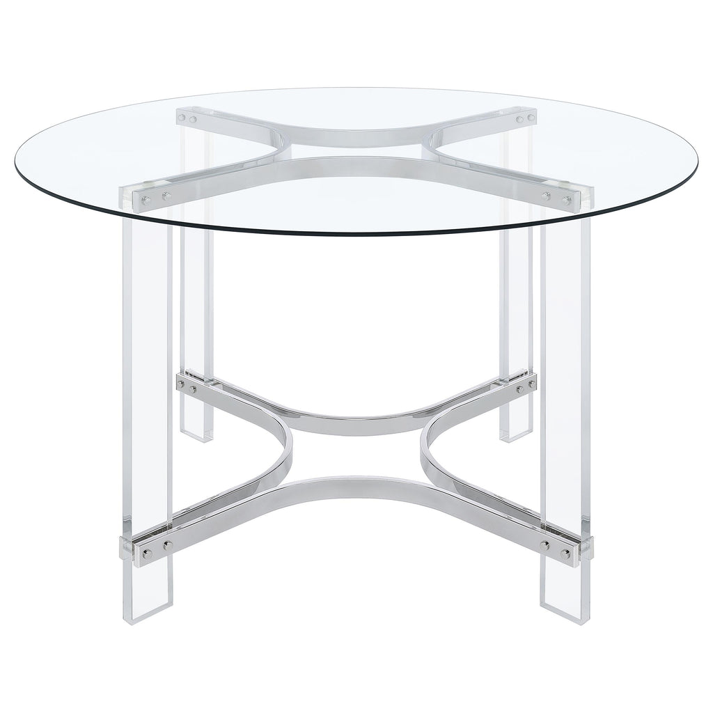 Elevate your dining experience with this chic, contemporary dining set, where modern design meets airy elegance. This set includes a stunning round glass-top table with clear acrylic legs that create a sleek, sculptural profile, complemented by gleaming chrome accents for a touch of sophistication. Four side chairs with clear acrylic seats and backs complete the set, adding a minimalist yet comfortable touch to your space. The sled-inspired chrome bases of the chairs provide stability and a dynamic contrast to the graceful curves of the acrylic, making this set an eye-catching centerpiece for any modern dining room or breakfast nook. Perfectly suited for compact spaces, this set combines style and functionality, offering a light and open feel that effortlessly enhances any decor.