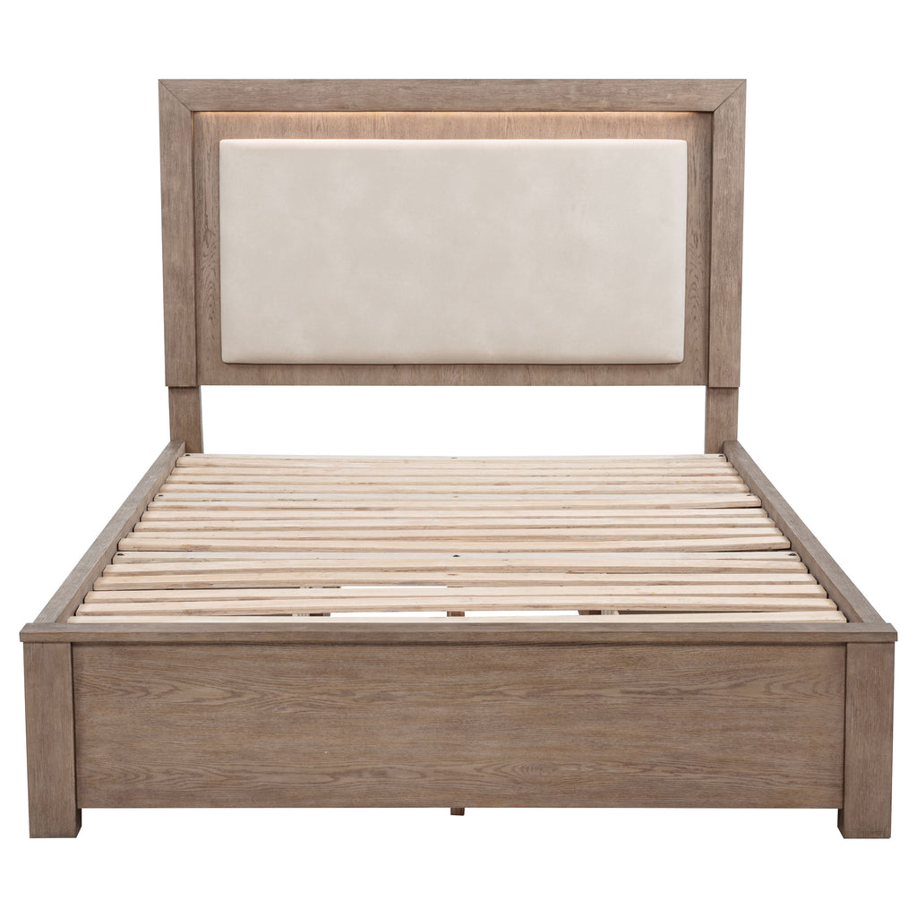 Make the most of every inch in your stylish bedroom with a modern four-drawer wooden bed that includes an upholstered headboard with LED lighting for easy ambiance. The bed boasts a barley brown finish over wood grain details, creating a soft, neutral palette with organic flair. Four drawers are tucked underneath platform slats, creating ample storage that's perfect for everything from clothing and linens to personal items. The bed is defined with a squared headboard that features an upholstered panel with foam cushioning and beige upholstery, perfect for lounging with a book or movie. Built-in LED lighting is a perfect complement, adding soft, inviting ambiance in your bedroom.